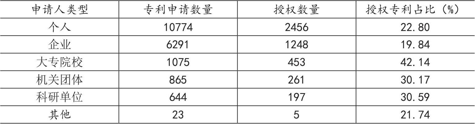对黄连相关专利各类型申请人的专利申请量和专利授权量进行统计分析,统计结果见表2-2-2,可见,在黄连领域,大专院校、机关团体、科研单位等院所具备较强的科研实力,其在黄连领域的专利授权占比较高。企业在黄连领域的专利申请量较大,但授权专利占比较低,说明企业在相应领域科研创新能力方面还有所欠缺,企业应加强与科研院所的相应合作,以提高其科研创新能力,并加速科研院所相应研究成果的转化利用,实现双赢的目的。