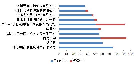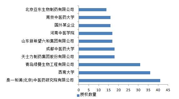 另外,对授权专利对应的专利权人进行分析,图2-2-4展示了黄连领域授权专利数量排名前十位的主要专利权人,其中,泰一和浦(北京)中药研究院有限公司以41件授权专利数量位列第一,西南大学以36件授权专利数量位列第二。授权专利数量的多少反映出相应申请人所涉及的专利申请质量的高低,从图2-2-4展示的结果可以看出中药创新研究开发的主体在于科研院校和制药企业。企业可与高校加强合作,将高校有前景的研究成果加以运用。