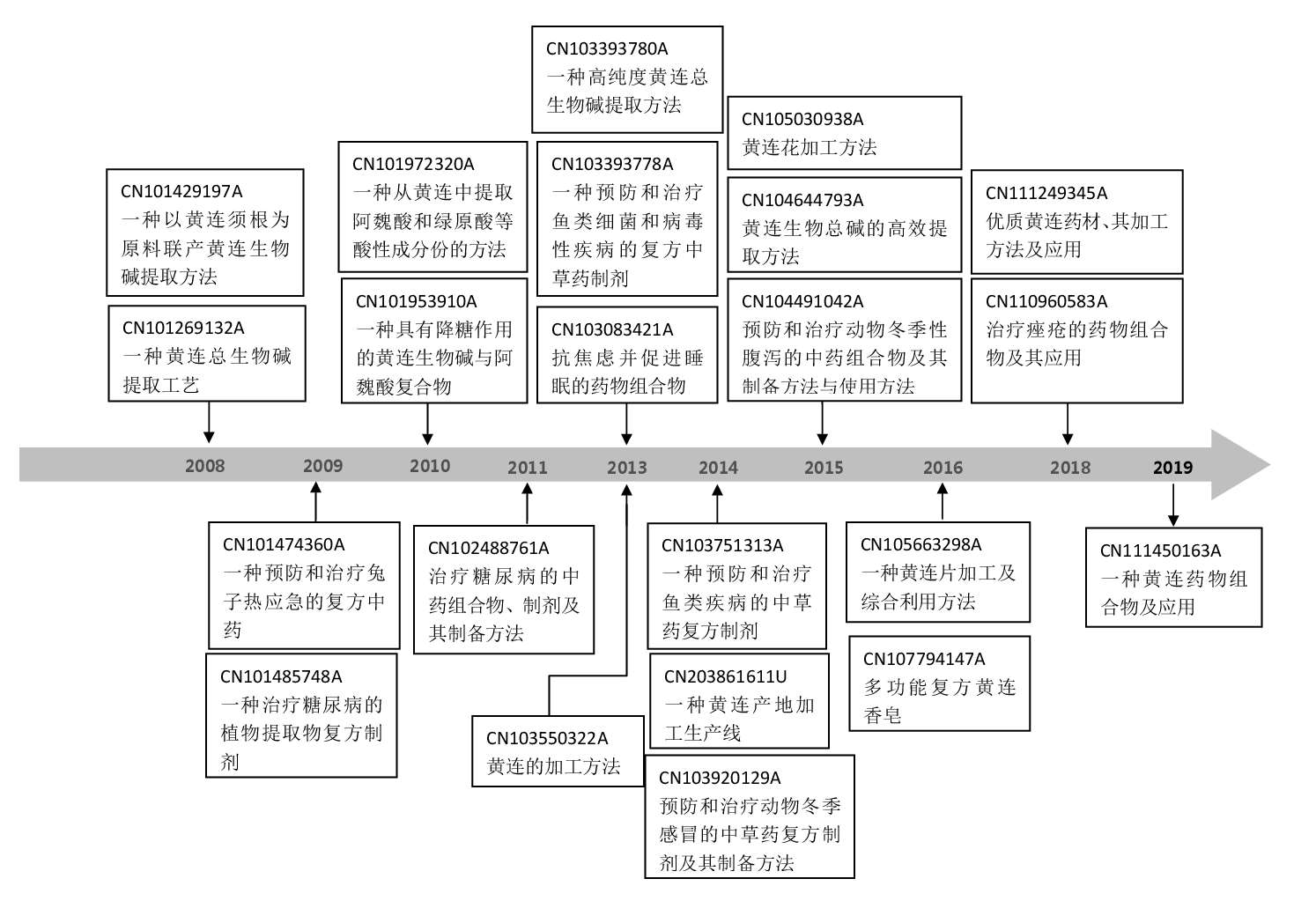 关于药效成分的提取,西南大学分别于2008、2010、2015年先后申请了专利CN101429197A一种以黄连须根为原料联产黄连生物碱提取方法、CN101269132A一种黄连总生物碱提取工艺、CN101972320A一种从黄连中提取阿魏酸和绿原酸等酸性成分份的方法、CN103393780A一种高纯度黄连总生物碱提取方法、CN104644793A黄连生物总碱的高效提取方法,可以看出上述黄连相关药效成分提取专利涉及了不同成分的提取方法同时也涉及了黄连不同药用部位相关药效成分的提取。在申请黄连相关药效成分提取专利时,该校也布局了黄连药材加工方法及加工设备的相关专利,如CN103550322A黄连的加工方法、CN203861611U一种黄连产地加工生产线、CN105663298A一种黄连片加工及综合利用方法、CN105030938A黄连花加工方法、CN111249345A优质黄连药材、其加工方法及应用。其中,2015年申请的专利CN105030938A黄连花加工方法,进一步拓展了黄连的药用部位,促进了黄连相关资源的充分利用。该校对黄连的相关专利布局还体现在药物组合物方面,涉及的专利有CN101474360A一种预防和治疗兔子热应急的复方中药、CN101485748A一种治疗糖尿病的植物提取物复方制剂、CN102488761A治疗糖尿病的中药组合物、制剂及其制备方法、CN103393778A一种预防和治疗鱼类细菌和病毒性疾病的复方中草药制剂、CN103083421A抗焦虑并促进睡眠的药物组合物、CN103751313A一种预防和治疗鱼类疾病的中草药复方制剂、CN103920129A预防和治疗动物冬季感冒的中草药复方制剂及其制备方法、CN104491042A预防和治疗动物冬季性腹泻的中药组合物及其制备方法与使用方法、CN110960583A治疗痤疮的药物组合物及其应用,上述包含黄连的药物组合物专利包含兽药以及人医用药,涉及的疾病主要包括糖尿病、焦虑及睡眠障碍、感冒、腹泻等。上述专利也体现了对黄连多功效开发的重视。