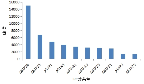 在原料药方面,A61K36、A61K35和A61K31占了本领域的最大比例。其中A61K 36主要涉及含有来自藻类、苔藓、真菌或植物或其派生物,例如传统草药的未确定结构的药物制剂,通过为以植物及其提取物、提取部位为原料;A61K 31是含有机有效成分的医药配制品;A61K 35是含有其有不明确结构的原材料或其反应产物的医用配制品;A61K 9是以特殊物理形状为特征的医药配制品。可见,黄连领域的专利申请中,对于化学成分以及有效部位的提取和研究以及相关药物剂型的研究较多。在中药领域,中药提取物成为推进中药现代化和中药技术创新的重要环节,也是中药进入国际市场的一种有效方式,而中药提取是中药产业链中的核心和关键环节,是中药从传统走向现代化的核心技术环节。中药剂型直接关乎中成药产品和中药衍生品,以上两者均与消费者市场直接相关,能够直接产生丰厚的利润价值,中药提取物和剂型的共同发展是我国中医药走向国际化的必经之路,也是创造中医药市场价值必不可少的要素。在黄连领域的专利申请中,有效成分和有效部位以及剂型的专利申请量数据可以说明在黄连药材方面,已经一定程度实现了现代化发展。其发挥作用的不仅仅只是药材本身,还包括从黄连药材中提取得到的单体成分或提取物,并且,为了适应市场的需求,已经逐步开发出了相应的剂型。