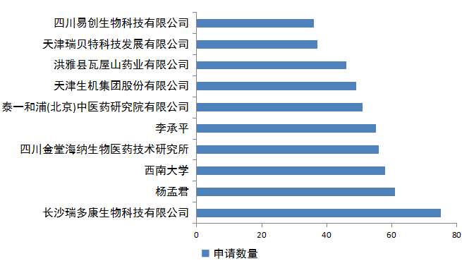 以专利申请人为条件对专利文献进行统计和排序,对专利申请的主体进行分析,可以发现黄连领域各个研发机构的科研实力,专利申请数量越多,研发实力越强。图2-2-3展示了黄连领域专利申请量排名前十位的主要专利申请人,长沙瑞多康生物科技有限公司已以75件专利申请数量位列第一。位列前10的主要专利申请人中,高校1个、企业7个、个人2个。对应的专利申请数量也可以从一定程度上说明高校和企业具备较强的科研实力,可以促进高校和企业的相关合作,整合优势资源,持续推动黄连产业的现代化发展。