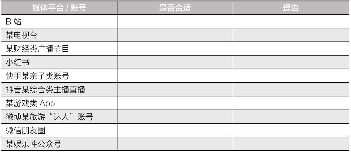 假如你是一家一线母婴品牌的营销策划人员,需要为公司近期的新品纸尿裤的宣传选择1~3个媒体平台,从优质媒体的角度来初步判断,选择下面哪几个媒体平台合适?理由是什么?完成表1-4。