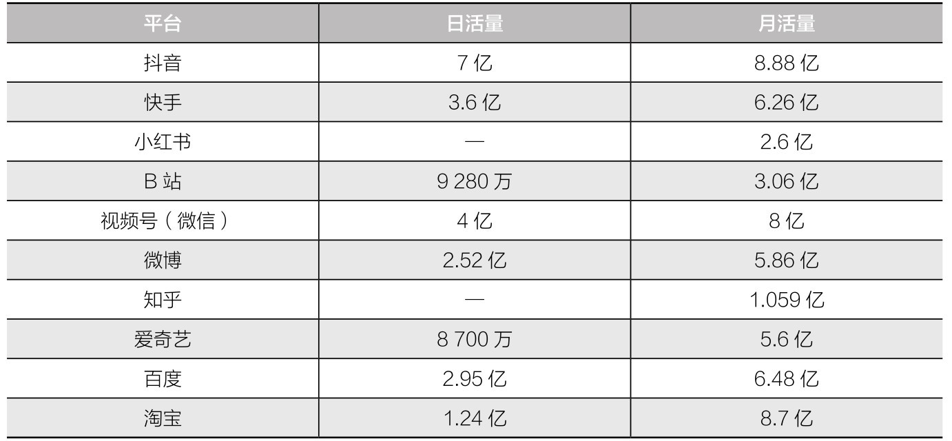 表1-3所示为一些热门新媒体平台2022年的活跃用户数据。注意,日活量和月活量是不断变化的,有浮动,这里取最高数据。