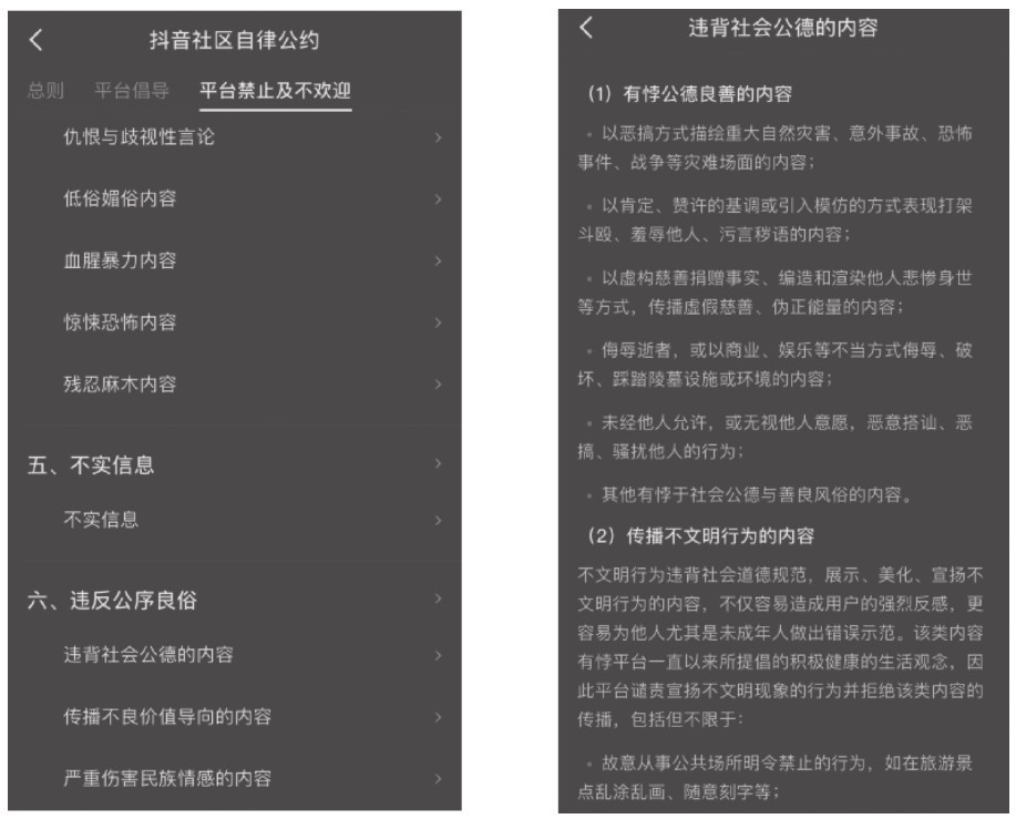 例如,抖音平台对内容监管较为严格。在抖音平台的社区自律公约处,可以看到“平台倡导”“平台禁止及不欢迎”等内容。在“平台禁止及不欢迎”处,可以看到有悖公德良善、传播不文明行为等的界定和详细解释,如图1-2所示。