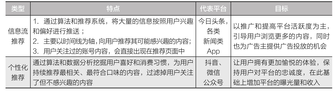 信息流推荐和个性化推荐的区别如表1-5所示。