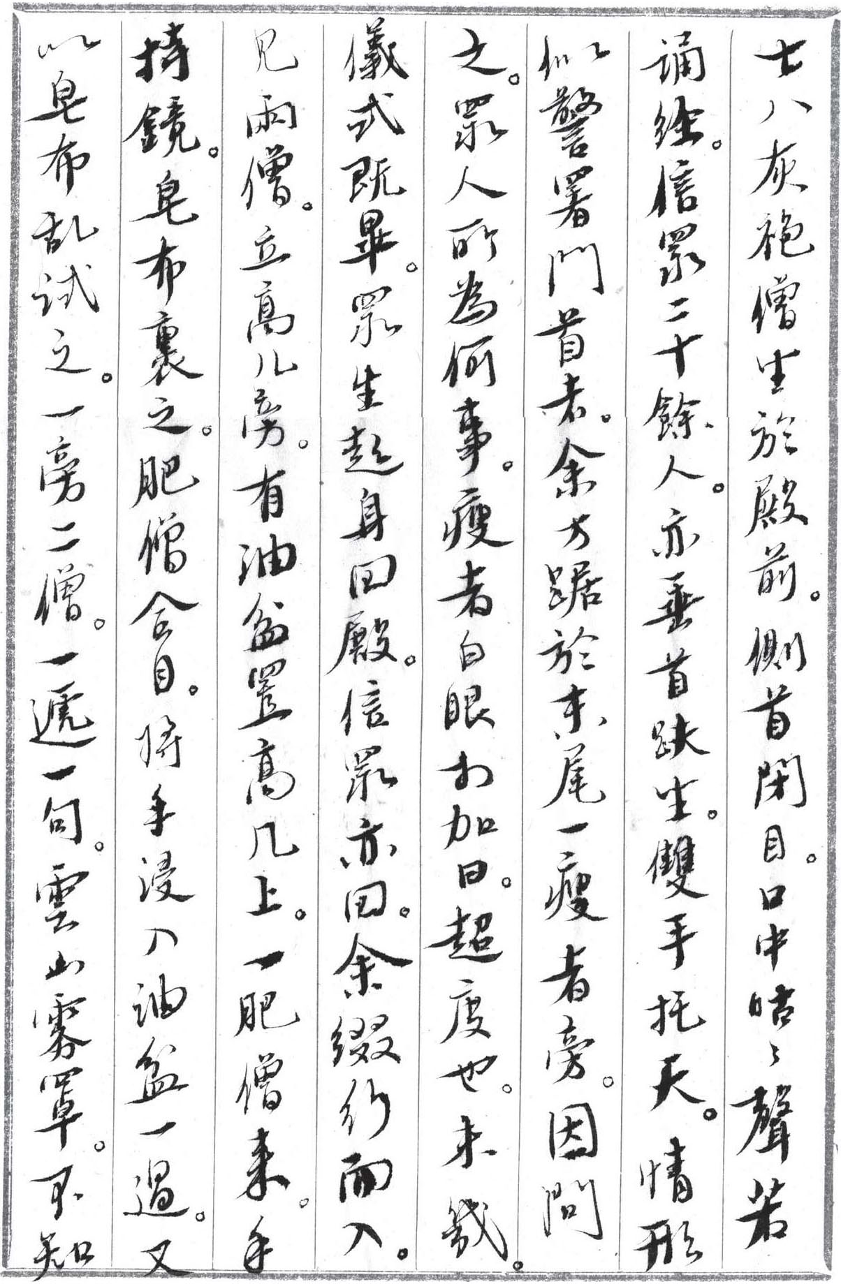 跪着的人里走出个胖子,是这房子的主人,名叫赵三。他在西四这片房子不少,靠吃瓦片 (金醉注:收房租) 为生。赵三说,烧死的和尚是他的房客,城郊地藏庵的高僧,法号仁山。他指指地上一片跪着的人,说仁山法师是活佛,信徒遍布南城。法师在赵三这儿赁了间房,是为了在城里布施方便。赵三对活佛毕恭毕敬,不收房钱,只要他每月到家里念一通经保平安,没想到活佛连自己的平安也没保住。