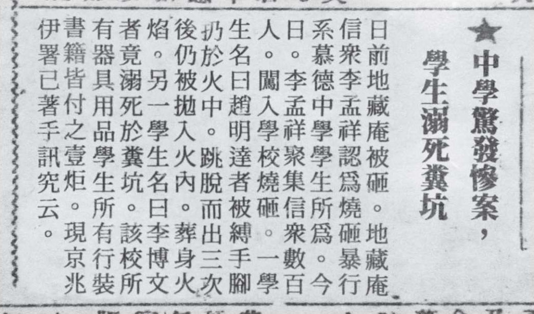 报纸上说,地藏庵的信众不信和尚是假,闯进慕德中学,放火烧了学校,还打死了两个学生。其中有个瘦高个儿,叫李博文,被人摁进厕所闷死了。