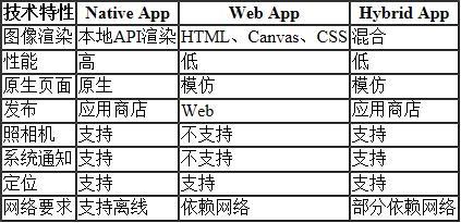 Native App、Web App、Hybrid App技术特性总结如表2-1所示。