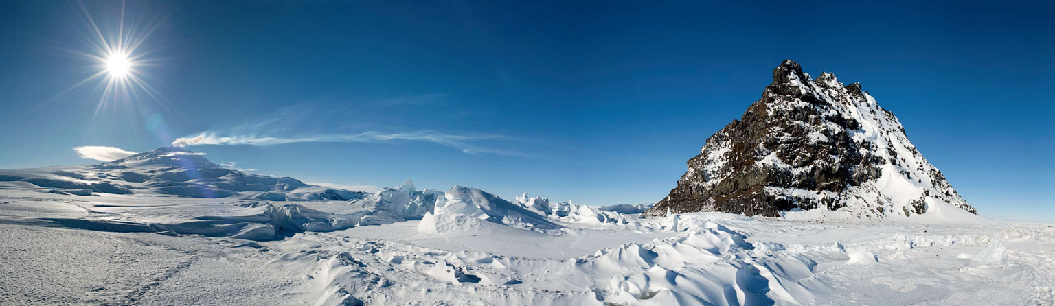 麦克默多湾海冰一景。背景为正在活动的埃里伯斯火山。海冰和岩冰衔接的地方形成了一道冰脊。冰层之下也有相当壮观却罕见的景色。