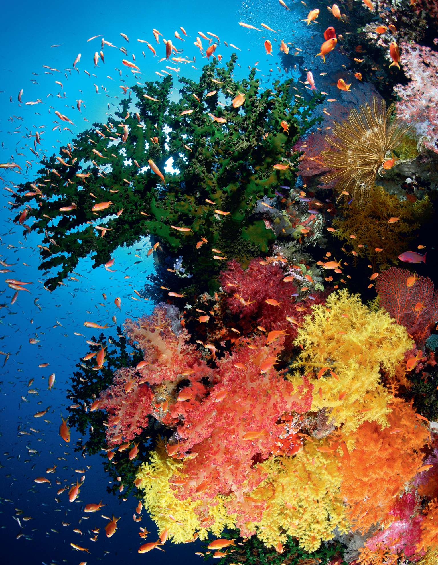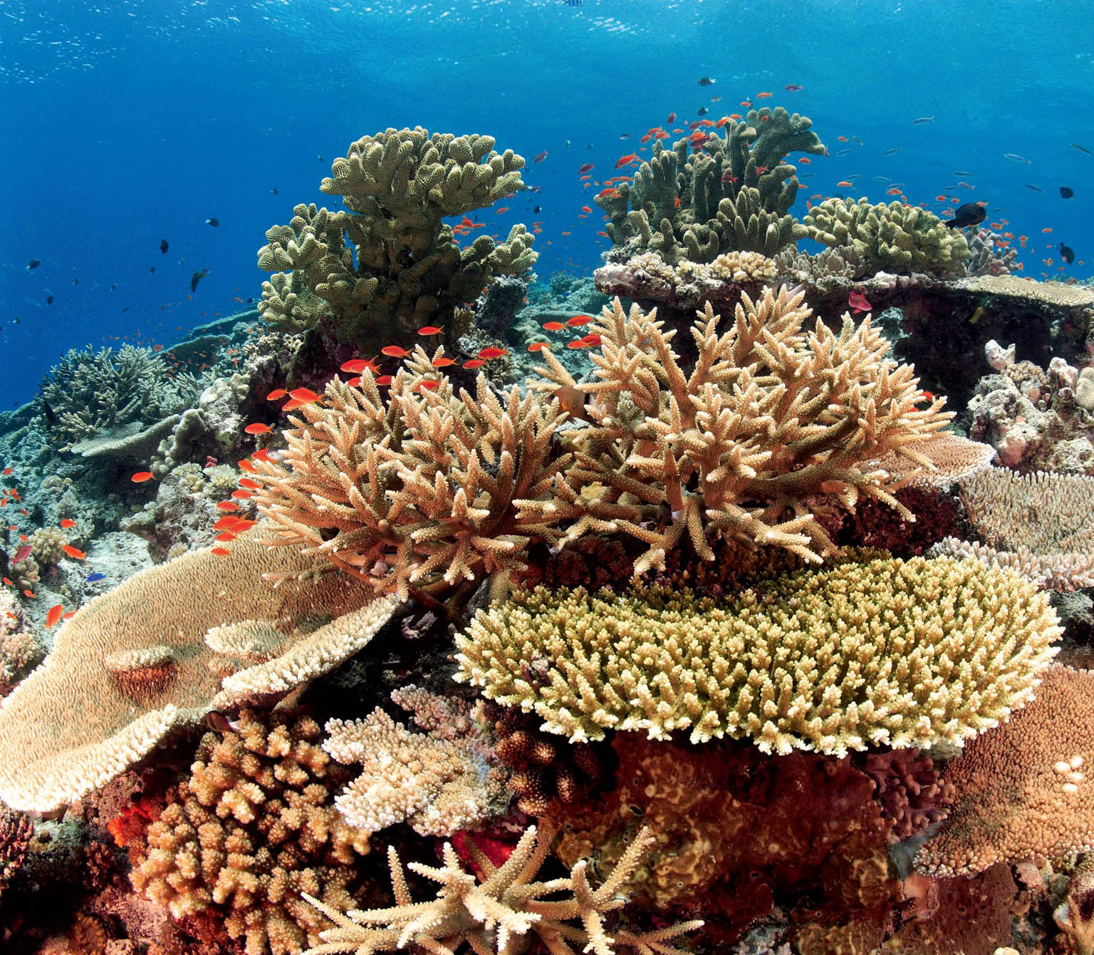 由硬珊瑚和坚硬的碳酸钙骨架构成的珊瑚礁。像植物一样,珊瑚虫相互争夺空间和阳光,长成各种形状。该图主要展现了桌面珊瑚、鹿角珊瑚和安氏杯形珊瑚。阳光使得珊瑚虫体内的微小生物(甲藻)进行光合作用,并产生糖分和氧气,为珊瑚虫所用。
