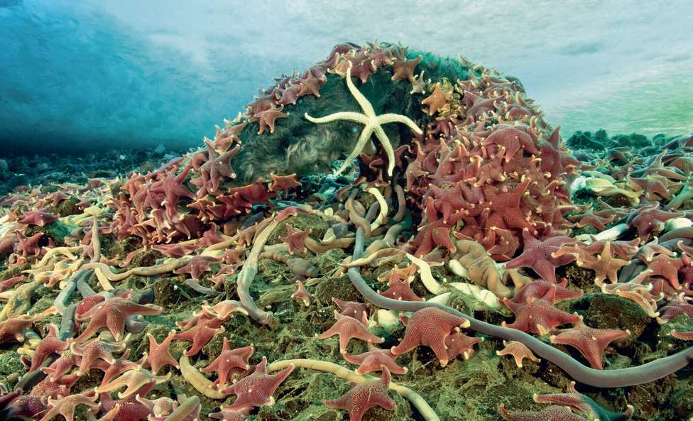 大多数生物连同浮游生物一并沉入海底,海底也因此变得生机勃勃。不过,生机勃勃是相对而言的,因为在水温接近冰点的海水中,所有的动物都行动迟缓,动作几乎无法察觉。
