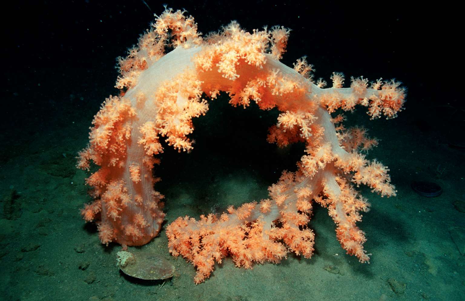 另一种生活在此处的独特的无脊椎动物就是巨型软珊瑚。这种号称“深海珊瑚”的动物有1.5米高,珊瑚虫从水中取食,并收集水中的营养物质以及幼小的无脊椎动物。但是在这个水流几乎静止不动的地方,没有足够的食物,所以,巨型软珊瑚通过横扫四周来获得食物。它会改变珊瑚主干一侧的水压,以便弯向一边并可以接触到海底沉积物。珊瑚虫抓取该区域的所有食物后会直起身,然后弯向另一边,直到它捕食一整圈。更为神奇的是,巨型软珊瑚从不选择一个物体作为永久的依靠,它会脱离所依附的岩石或扇贝,像蠕虫一样,沿着海底爬向另一个有食物的地方。
