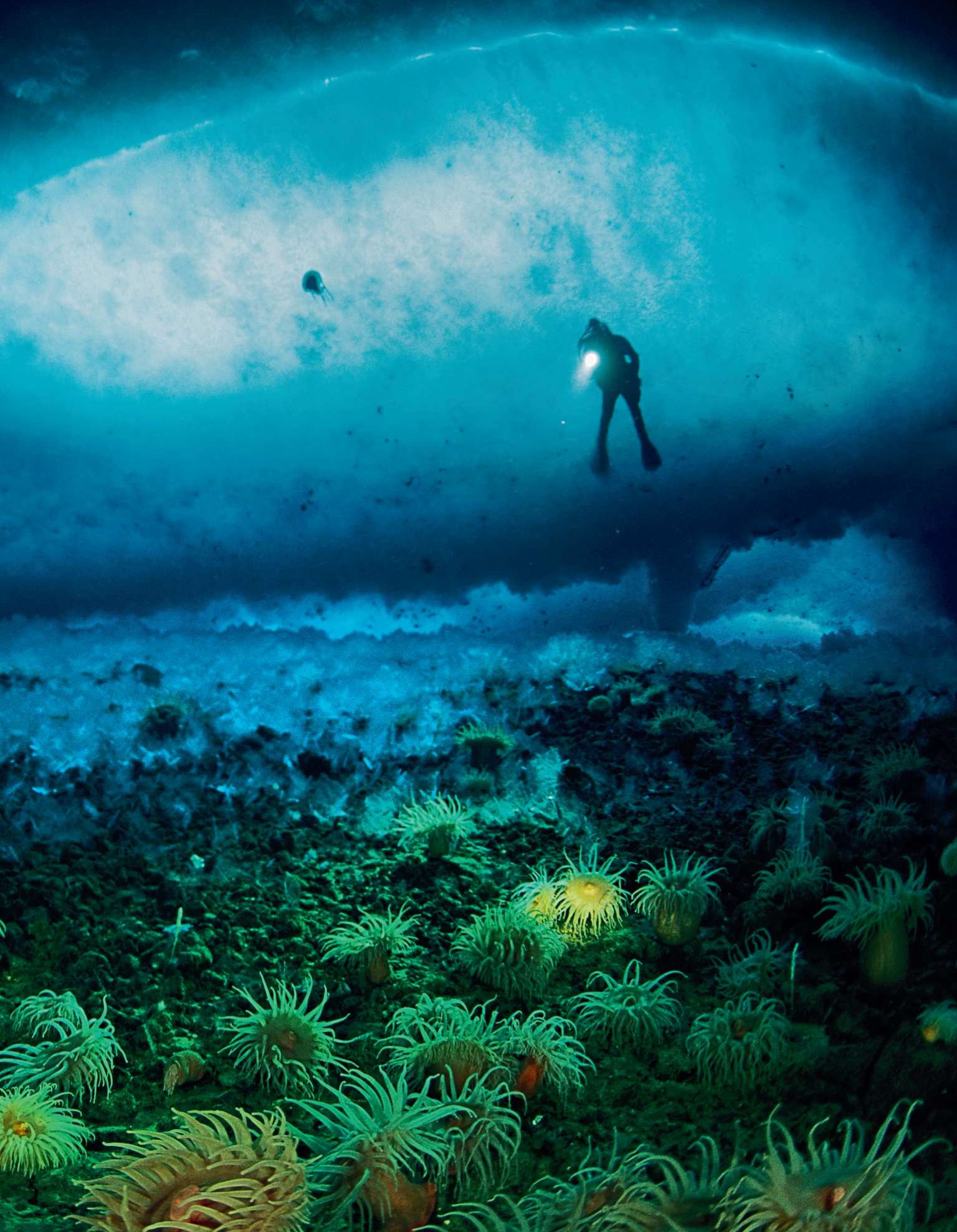 南极海葵被海冰裂缝中透进的光照亮。它们是贪婪的捕食者,能捕捉大型动物,如海蜇。它们也可以四处游动,以避免碰到它们身后的锚冰。