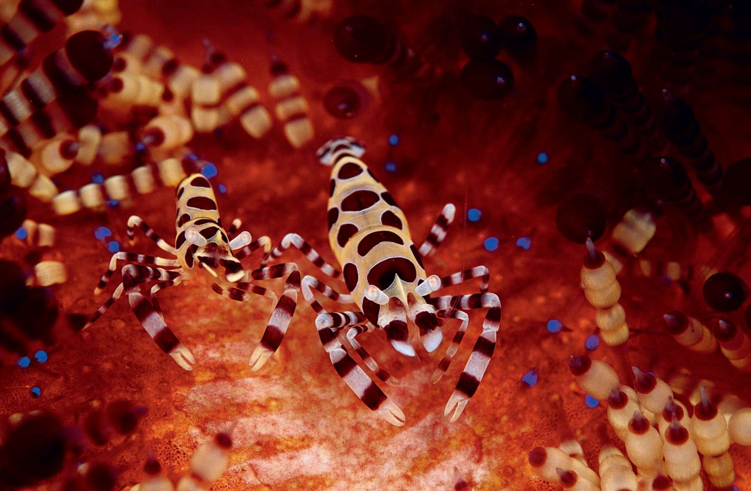 有毒的火焰海胆上的一对伪装的科尔曼虾。它们只生活在火焰海胆上,除去火焰海胆上的一些尖硬突起作为它们生活的地方,而依靠其他突起来保护自己。作为回报,它们会清除宿主身上的岩屑和寄生物。这是珊瑚礁上许多共生关系中的一种。