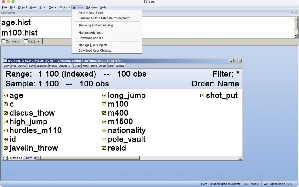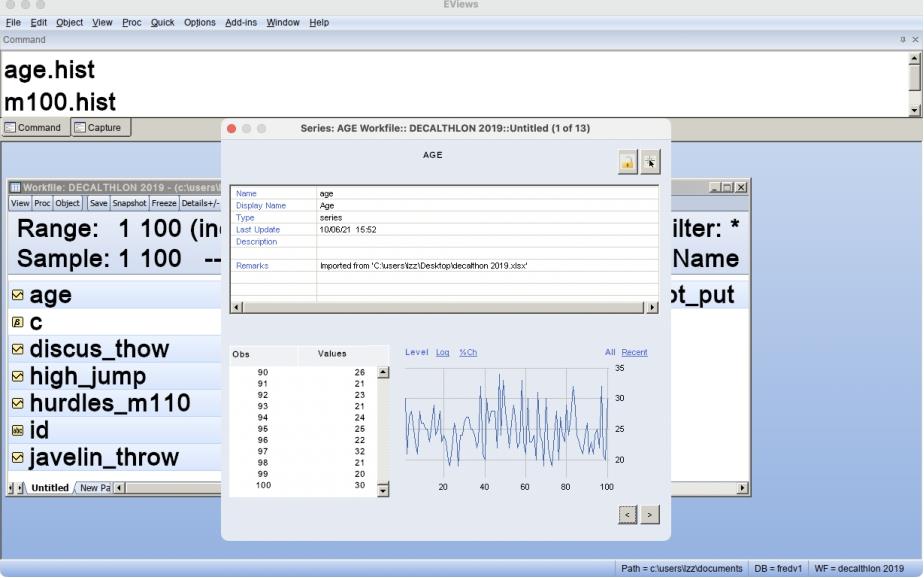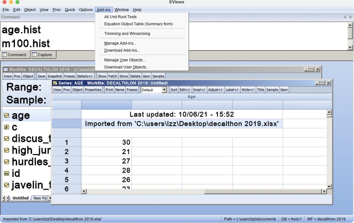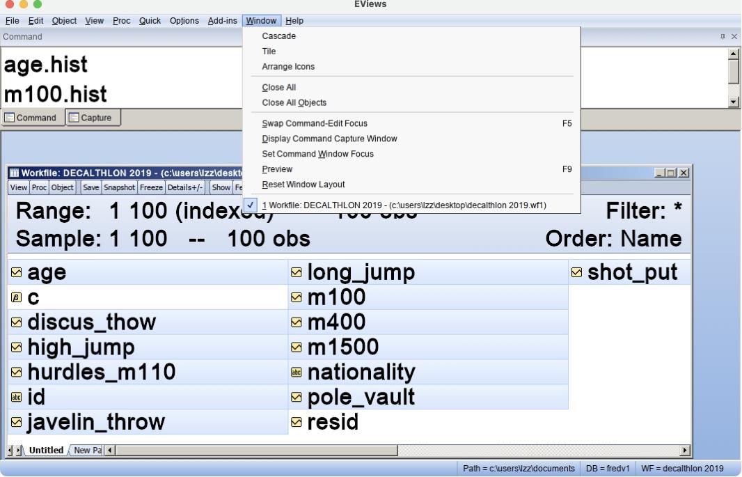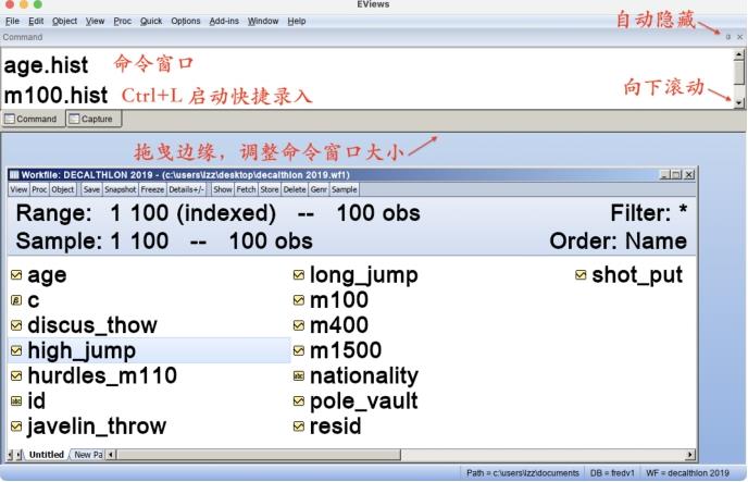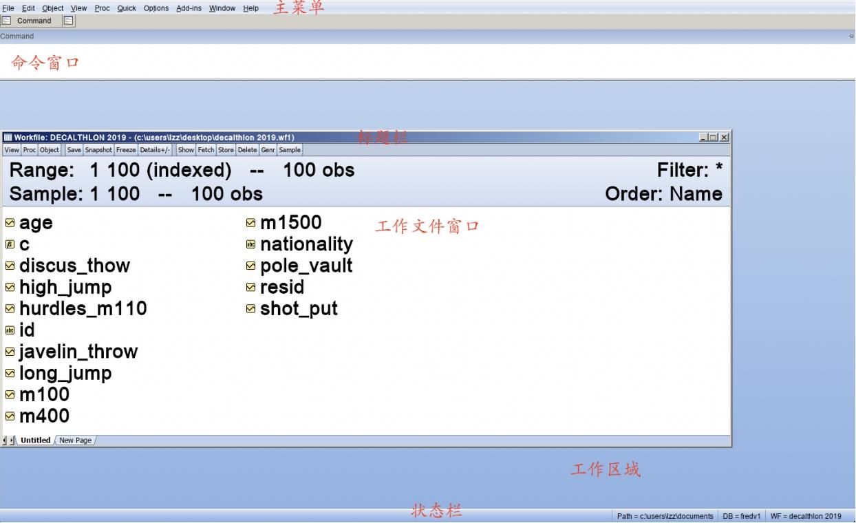 Eviews窗口的最上面一栏是主菜单,主菜单下方是命令(Command)窗口。中间是工作区域(Work Area)。工作文件窗口的标题栏显示了工作文件“decalthlon 2019.wf1”的名称和存储路径。