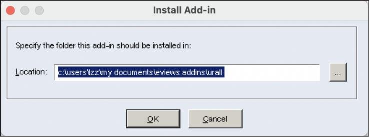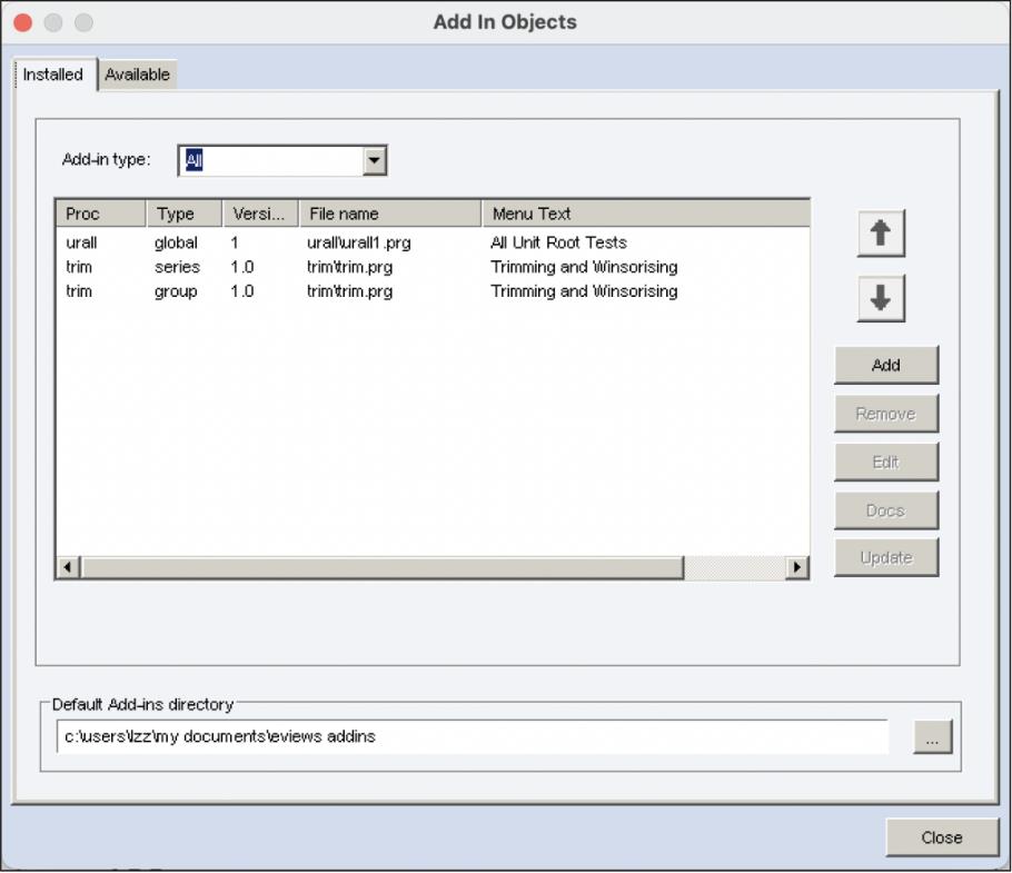 Eviews插件分为全局插件和特定对象插件两种类型。全局插件适用于多种类型的对象,安装后,用户可通过菜单“Add-ins”调用该插件。特定对象插件只适用于特定类型的对象。