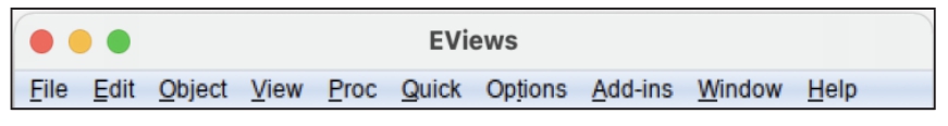 “Help”菜单用于获取帮助信息,包括访问在线帮助(Online Eviews Help)、打开帮助索引(Eviews Help Topics...)、打开Eviews的用户手册(PDF Docs)、访问Eviews论坛(Eviews User Forum)、检查更新(Eviews Update...)、查看版本号和注册用户信息(About Eviews)。
