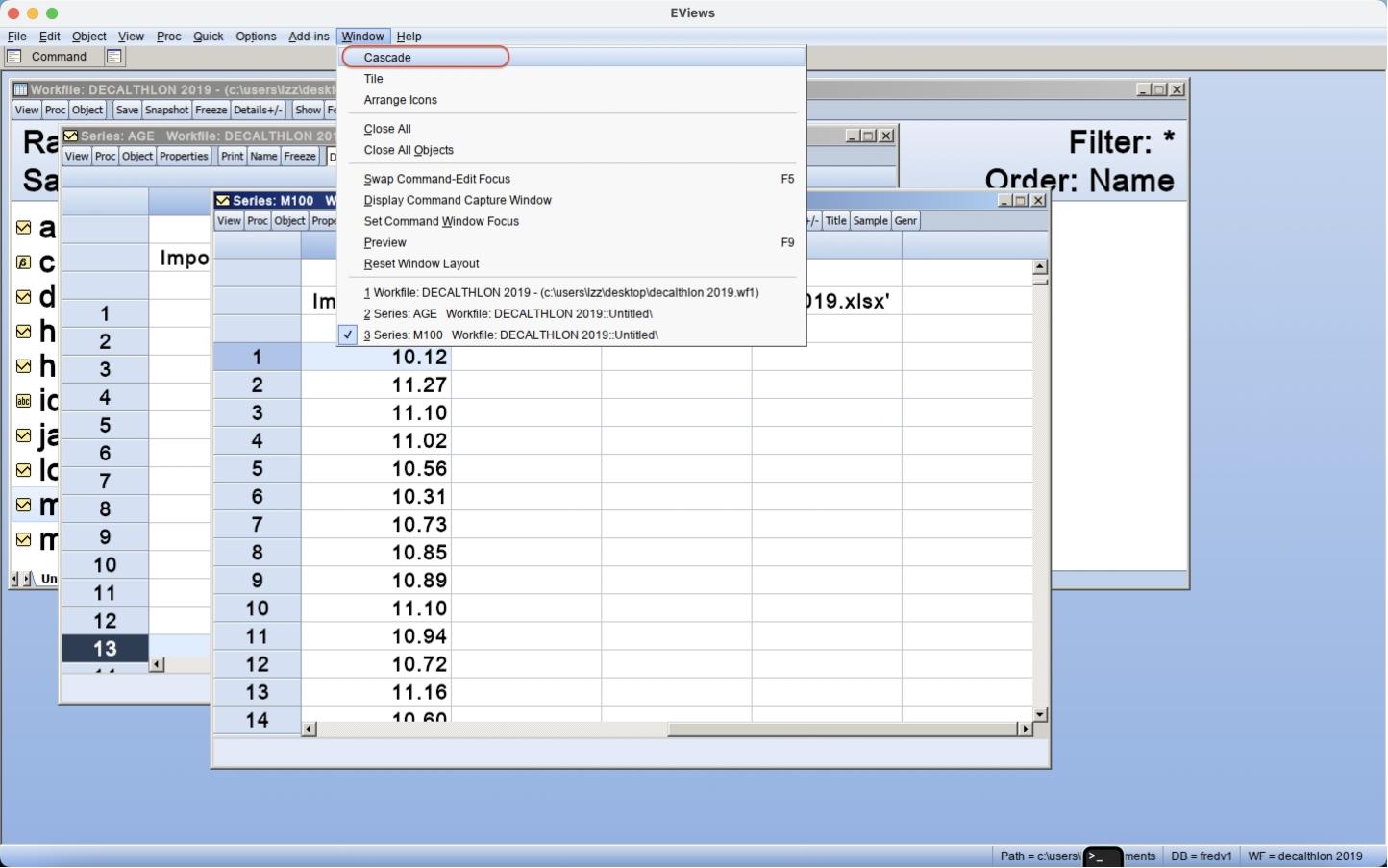 “M100”序列窗口标题栏呈深蓝色,表明该窗口处于激活状态。“decalthlon 2019.wf1”工作文件窗口和“age”序列窗口的标题栏呈灰色,表明这两个窗口处于非激活状态。“Windows”菜单最下方罗列了3个打开的窗口的名称,“M100”序列前有一个勾选标记,表明该窗口处于激活状态。当打开的窗口很多时,可以在此迅速切换到需要查看的窗口。同时按下“Ctrl”键和“Tab”键,可在打开的窗口之间逐一切换激活状态。
