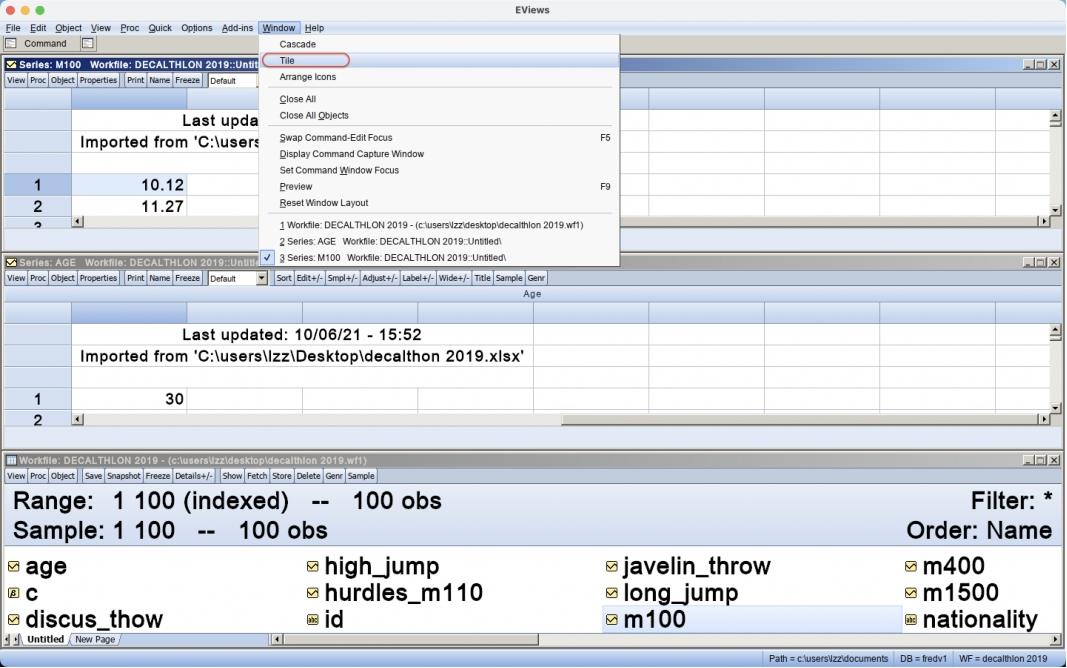 依次单击主菜单“Window/Tile”,“decalthlon 2019.wf1”工作文件、“age”序列和“M100”序列3个窗口平铺排列,如图3.7所示。