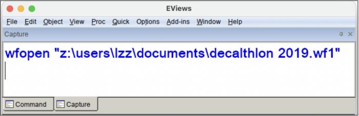 Eviews命令窗口的“Capture”选项卡用于自动记录用户通过菜单或者对话框执行的所有操作。单击“Capture”选项卡,如图3.5所示,显示打开工作文件“decalthlon 2019.wf1”的命令。“Capture”窗口的命令可以复制、粘贴到“Command”窗口,方便用户对其进行修改和编辑。