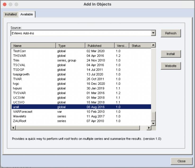 单击菜单“Add-ins/Download Add-ins...”,即可打开“Add In Objects”对话框,如图3.11所示。“Available”选项卡的列表框中罗列了可从Eviews官网下载的插件,包括插件的名称(Name)、类型(Type)、发布时间(Published)、版本(Version)和状态(Status)。