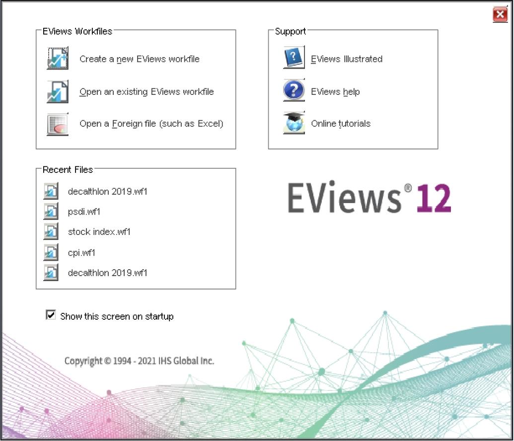 在该窗口最下方,若不勾选“Show this screen on startup”复选框,则以后启动Eviews时将不显示此欢迎页。