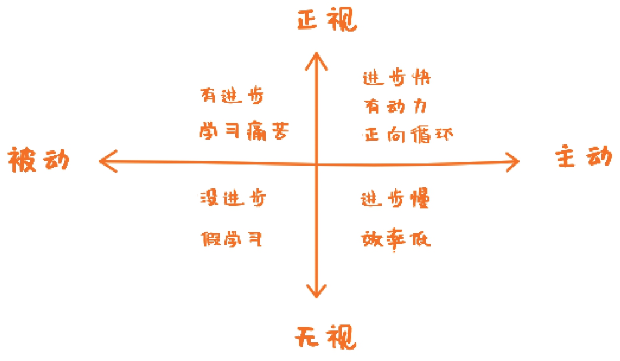 第一个是“被动学习、正视问题”。 指的是那些对学习缺乏主动性,但是对待问题比较积极的人。这些人在学习中会有一定的进步,但其学习过程往往是痛苦的,因为他们的主动性较低,总是被动地应对不断涌现的问题。