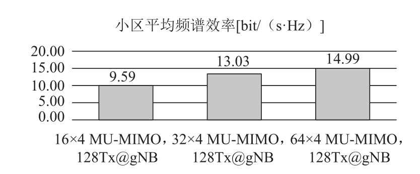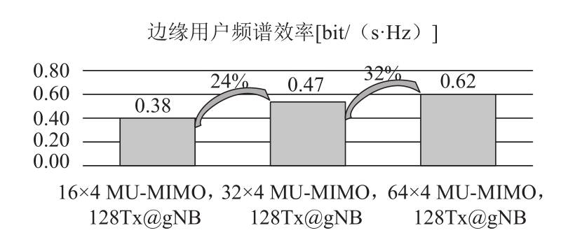 对于高频段(>7 GHz),如毫米波,由于5G系统的主要问题是保证宏小区的覆盖,而不是频谱效率,在实际的5G毫米波产品的Hybrid-MIMO架构中,数字通道只有4个,每个数字通道通过采用较多数目的天线单元来实现较细的模拟波束,从而保证小区同步信道、系统消息和物理控制信道等的基本覆盖。由于毫米波器件的非理想特性,毫米波器件很难支持高阶调制和高码率,再加上散射/衍射现象不明显,只能支持流数较少的MIMO传输。另外,考虑毫米波的大带宽,对毫米波传输的频谱效率要求一般不是很高。尽管3GPP中对毫米波系统开展系统级仿真评估的公司很少,数据结果并不全面,但根据以上分析,在5G系统毫米波eMBB场景下,宏小区频谱效率的基线参考值应该不是很有挑战性。如果6G系统毫米波超宽带场景在宏网的主要问题还是覆盖,则频谱效率提升就显得不那么必要了;但如果6G毫米波在宏网部署对频谱效率也有较高要求,则可以考虑“全数字”毫米波天线架构来提升同时调度的用户数和MIMO流数,但需要妥善解决消息/控制类信道在宏网中的覆盖问题,以及基站功耗问题。
