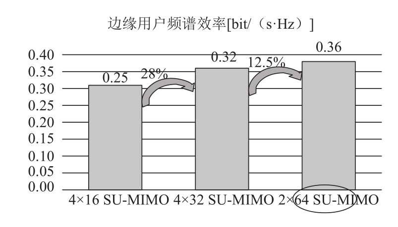 图2-7 中低频段部署下的宏小区eMBB场景的下行边缘频谱效率与天线数的关系