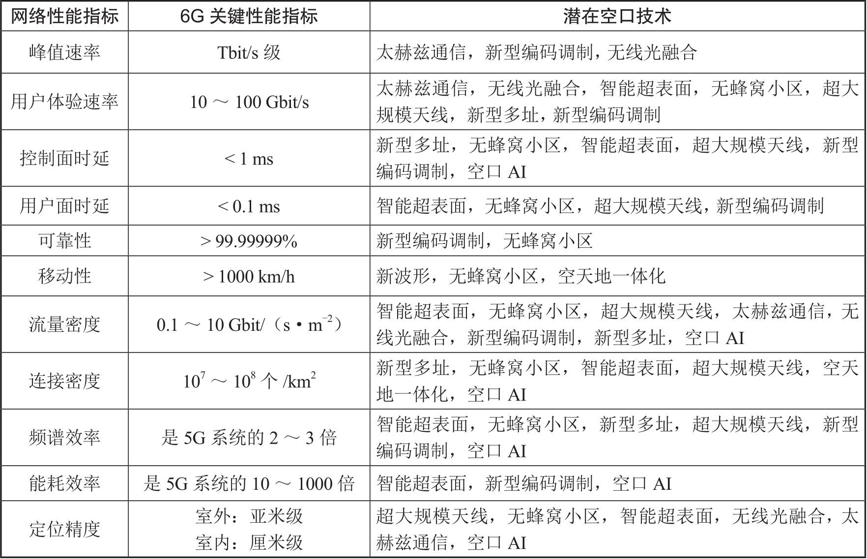 表2-5 6G网络的关键性能指标及潜在的空口技术