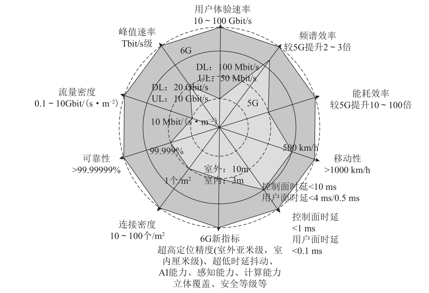 通过初步测算,可以大体梳理出6G关键性能指标,如图2-5所示。相比5G系统,未来6G系统在传统的关键性能指标上有更高的要求,例如,峰值速率从5G系统的10~20 Gbit/s提高到Tbit/s级,用户体验速率从5G系统的50~100 Mbit/s提高到10~100 Gbit/s,频谱效率较5G系统提升2~3倍,能耗效率相比5G系统提升10~100倍,移动性从500 km/h提高到1000 km/h,控制面时延从10 ms缩短到1 ms,用户面时延从4 ms/0.5 ms缩短到0.1 ms,流量密度从5G系统的10 Mbit/(s·m 2 )提高到0.1~10 Gbit/(s·m 2 ),可靠性从99.999%提高到99.99999%,连接密度从1个/m 2 增加到10~100个/m 2 。6G系统还有不少5G系统没有明确要求的新指标,如超高定位精度(室外亚米级,室内厘米级)、超低时延抖动、AI能力、感知能力、计算能力、立体覆盖、安全等级等。