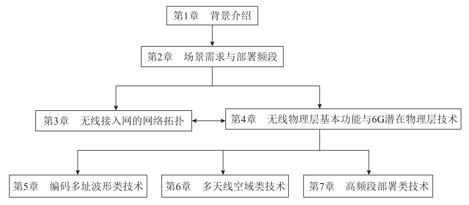 本书的结构如图1-4所示,在第1章对6G的背景进行介绍之后,第2章从场景需求和部署频段出发,提出了需求侧的指标要求和可能的频谱资源。第3章介绍6G无线接入网可能的网络拓扑,如地面通信、卫星通信、宏小区同构网、异构网等。第4章对无线物理层的基本功能进行综述,包括移动性管理、无线传输、无线定位等。第3章和第4章的关系是相辅相成的,无线接入网的网络拓扑在很大程度上决定了无线物理层的基本功能,而无线空口的各个技术大类又服务于不同的网络拓扑。接下来,本书分别按技术大类进行了相对深入的描述,第5章介绍编码多址波形类技术,包括信道编码与调制、信源信道联合编码、新型多址接入、潜在的新波形等。第6章介绍多天线空域类技术,包括基站/终端多天线技术的增强、智能超表面中继、全息无线电和统计态轨道角动量等。第7章介绍高频段部署类技术,包括太赫兹通信、可见光传输和通信感知一体化。需要指出的是,一些融合性的技术(如AI/ML使能空口)在本书中没有用单独的章节来统一介绍,而是分散在第5章到第7章的相关章节中予以介绍。本书内容安排点面结合,由浅入深,希望能够比较系统地给读者展现6G无线网络潜在关键技术的发展方向。