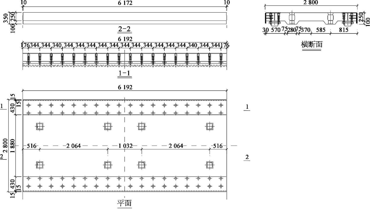 从上可见,叠合式轨道梁的设计思想是将轨道梁分为轨道板与承重梁两部分,其中轨道板由工厂预制,承重梁为常规的连续梁结构,采用工厂预制、现场制作或拼装等施工方法,将轨道板与支承梁之间通过连接机构在现场连接,形成叠合式轨道梁。其断面布置如图3-10所示。