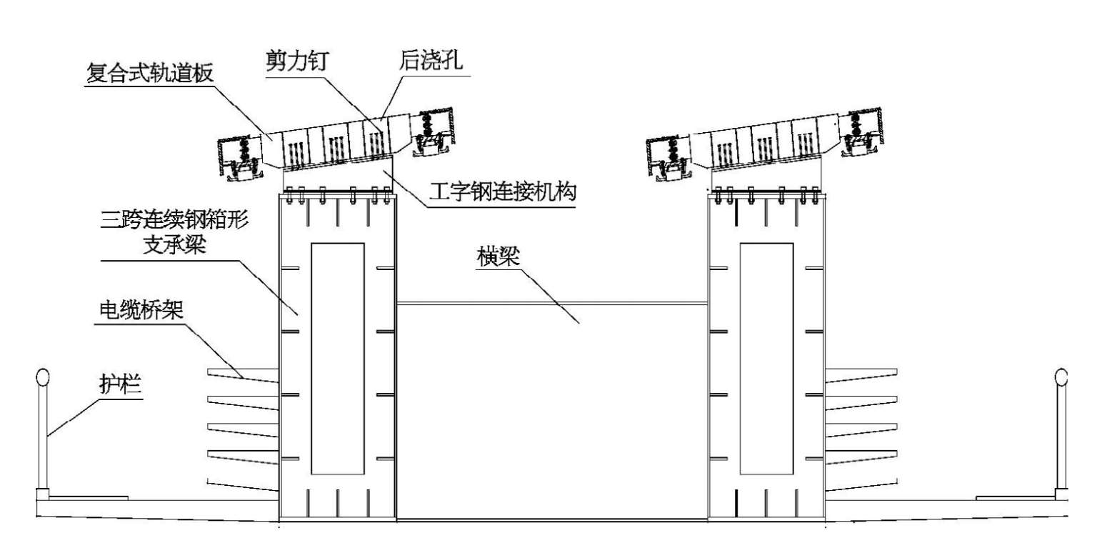 事实上,上海磁浮线在跨越川杨河和浦东运河时,由于所需的净跨径超出标准轨道梁跨径,已经进行了以钢结构为支承梁的叠合式轨道梁结构的初次尝试。为了跨越通航河道,上海磁浮线的浦东运河桥和川杨河桥均设计为三跨连续梁桥。根据河流的通航要求,两座桥梁的跨径布置分别为26.789m+45.408m+26.789m及23.22m+34.056m+23.22m。为达到施工精度要求,常用跨度轨道梁中预埋连接件的定位与功能件的安装均需要在工厂完成,而三跨连续梁跨径较大,无法在工厂完成整梁制造。浦东运河和川杨河上均采用了如图3-9所示的轨道结构,上层为轨道板,下层的支承梁为三跨连续钢箱梁,A、B轨支承梁之间采用钢横梁连为整体,轨道板与支承梁之间通过工字钢断面的连接机构相连接,连接机构的下翼缘与支承梁之间采用螺栓连接,连接机构的上翼缘焊有剪力钉,待轨道板就位后,在后浇孔中采用混凝土将轨道板与连接机构连接为整体。