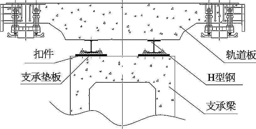 借鉴铁路轨排的经验,我们还提出了一种沿线路纵向埋设H型钢,并以扣件固定的连接机构。在线路 y 、 z 两个方向上,通过扣件扣紧,在纵向 x 方向上,扣件允许产生一定的位移,以达到释放温度应力的效果。扣件型式的连接结构型式如图3-19所示。