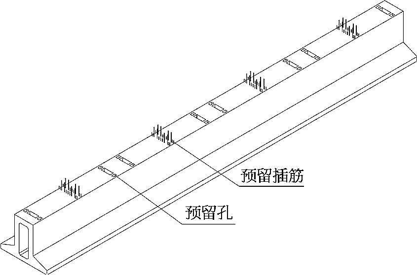 由于叠合式轨道梁需要在现场将上层轨道板和下层支承梁连接为一体,对于曲线梁,如果采用与复合式轨道梁同样的方式将轨道横坡角设置在支承梁上,则对支承梁的制造要求较高,且增加现场施工难度。因此,将横坡设置在轨道板上,而支承梁可采用直壁箱形梁。其基本型式如图3-11所示。基于成本因素,通常采用常规的预应力混凝土直壁箱梁。在支承梁与轨道板H型钢的连接处预留孔,用于浇捣与轨道板连接的支承台。与轨道板上的预留孔相同,支承梁上预留孔中的钢筋不切断。支承梁上预留的插筋与轨道板的预留孔结合,在两侧的连接机构固定后,同样灌注混凝土,完成轨道板与支承梁之间的固结。
