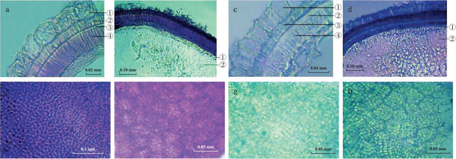 a. 菟丝子横切面一(①种皮表皮细胞,②外种皮栅状细胞层,③光辉带,④内种皮栅状细胞层);b. 菟丝子横切面二(①外层胚乳细胞,②内层胚乳细胞);c. 南方菟丝子横切面一(①种皮表皮细胞,②光辉带,③外种皮栅状细胞层,④内种皮栅状细胞层);d. 南方菟丝子横切面二(①外层胚乳细胞,②内层胚乳细胞);e. 菟丝子粉末种皮表皮细胞;f .菟丝子粉末种皮栅状细胞;g. 南方菟丝子粉末种皮表皮细胞;h. 南方菟丝子粉末种皮栅状细胞