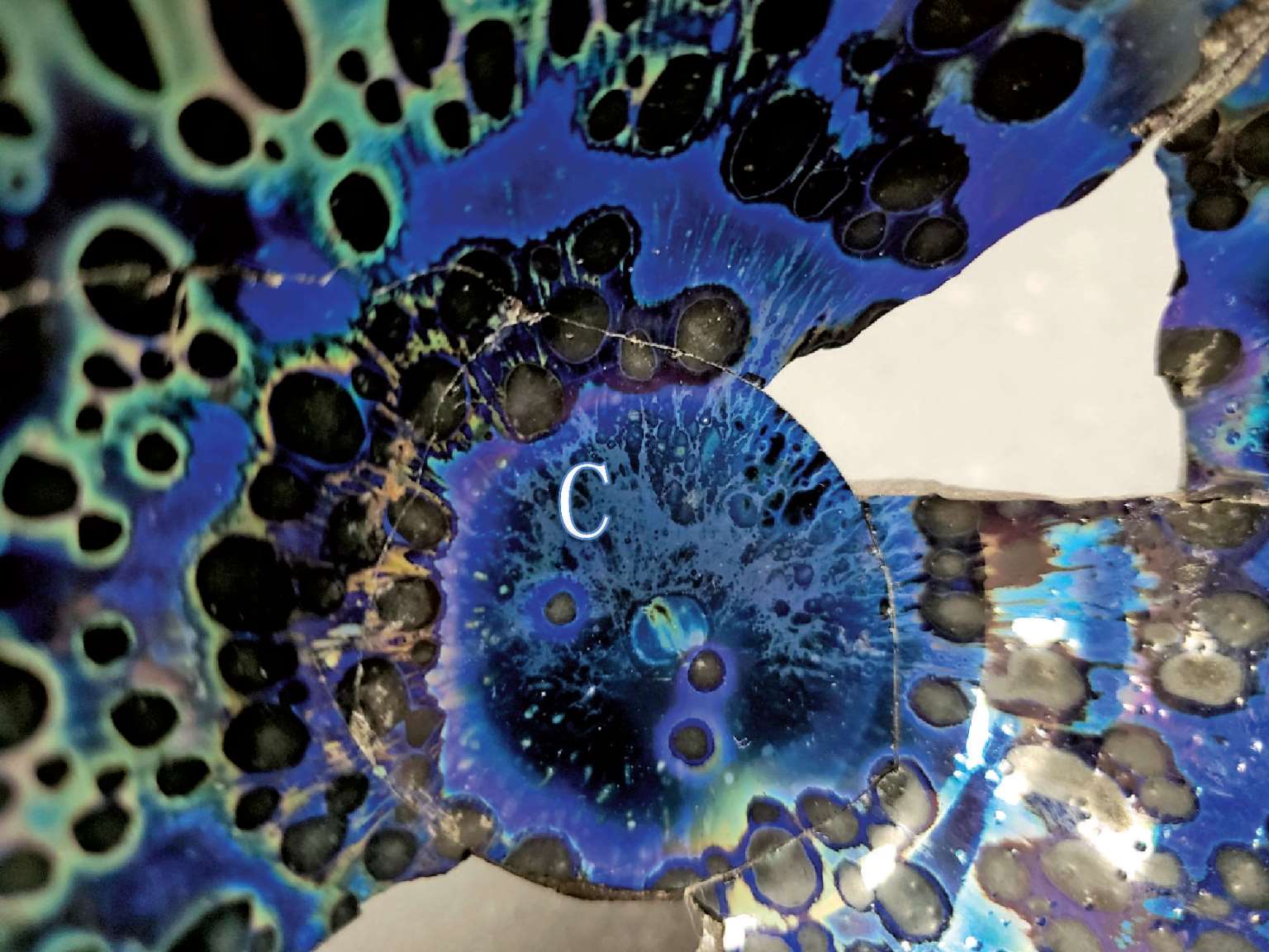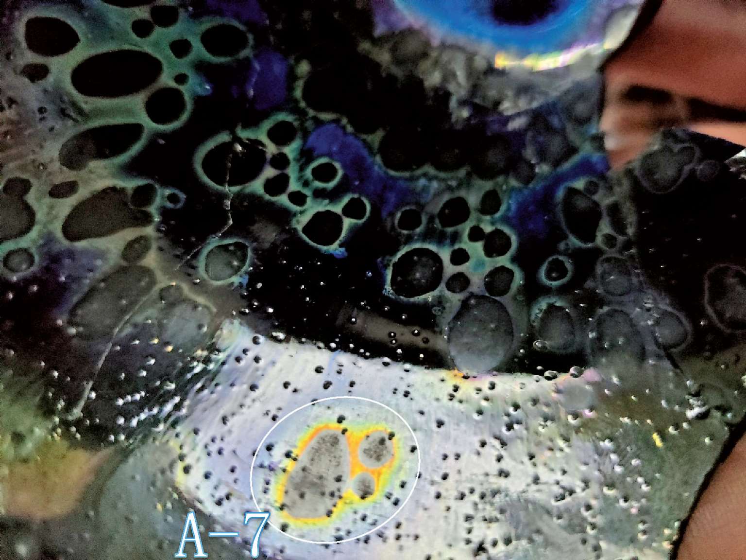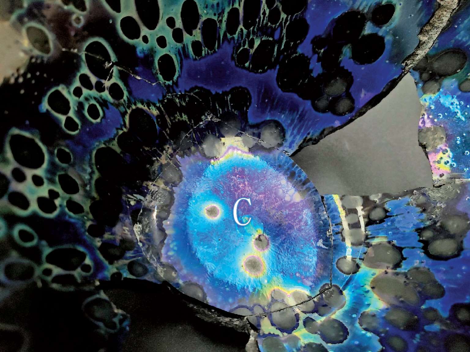 口沿下方的A-1区变为光亮多彩(图2-2b、c),成为颜色最丰富的区域之一,且彩色区的条纹非常明显,斑核a周缘的光晕呈现黄-绿-蓝-紫红的色圈模式(图2-2b)。A-1区斑核下方原本的青蓝色(图2-2a)变为高亮的橙色,米黄变为紫红(图2-2b)。