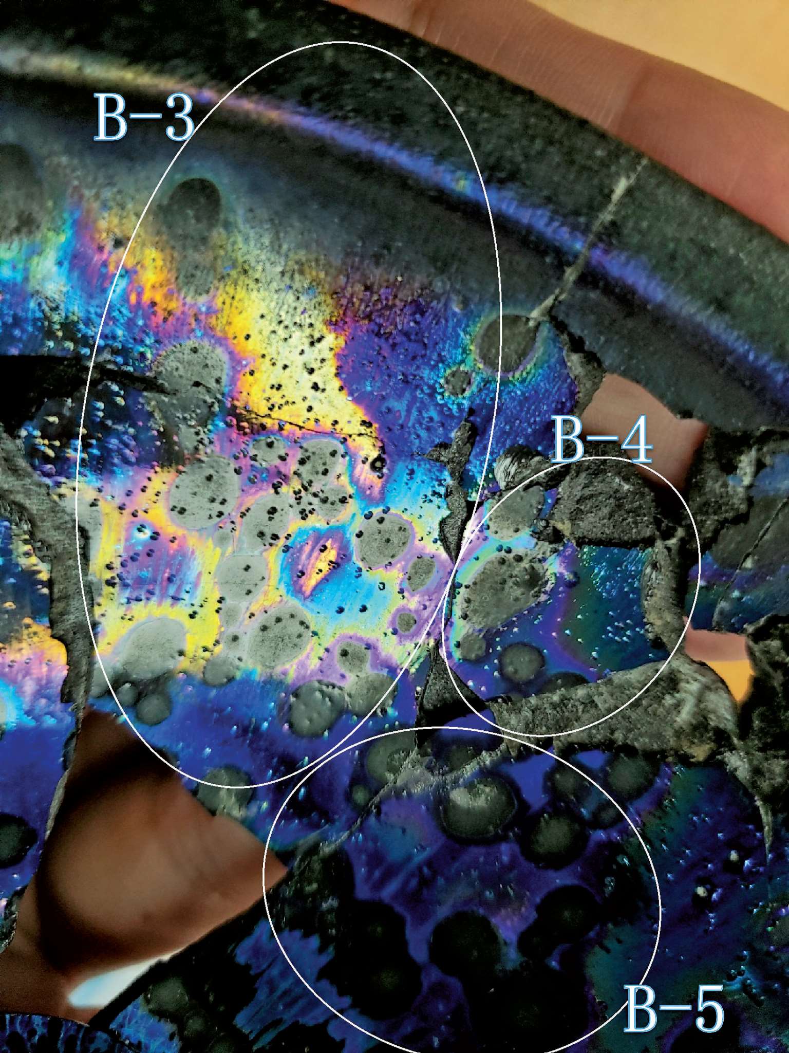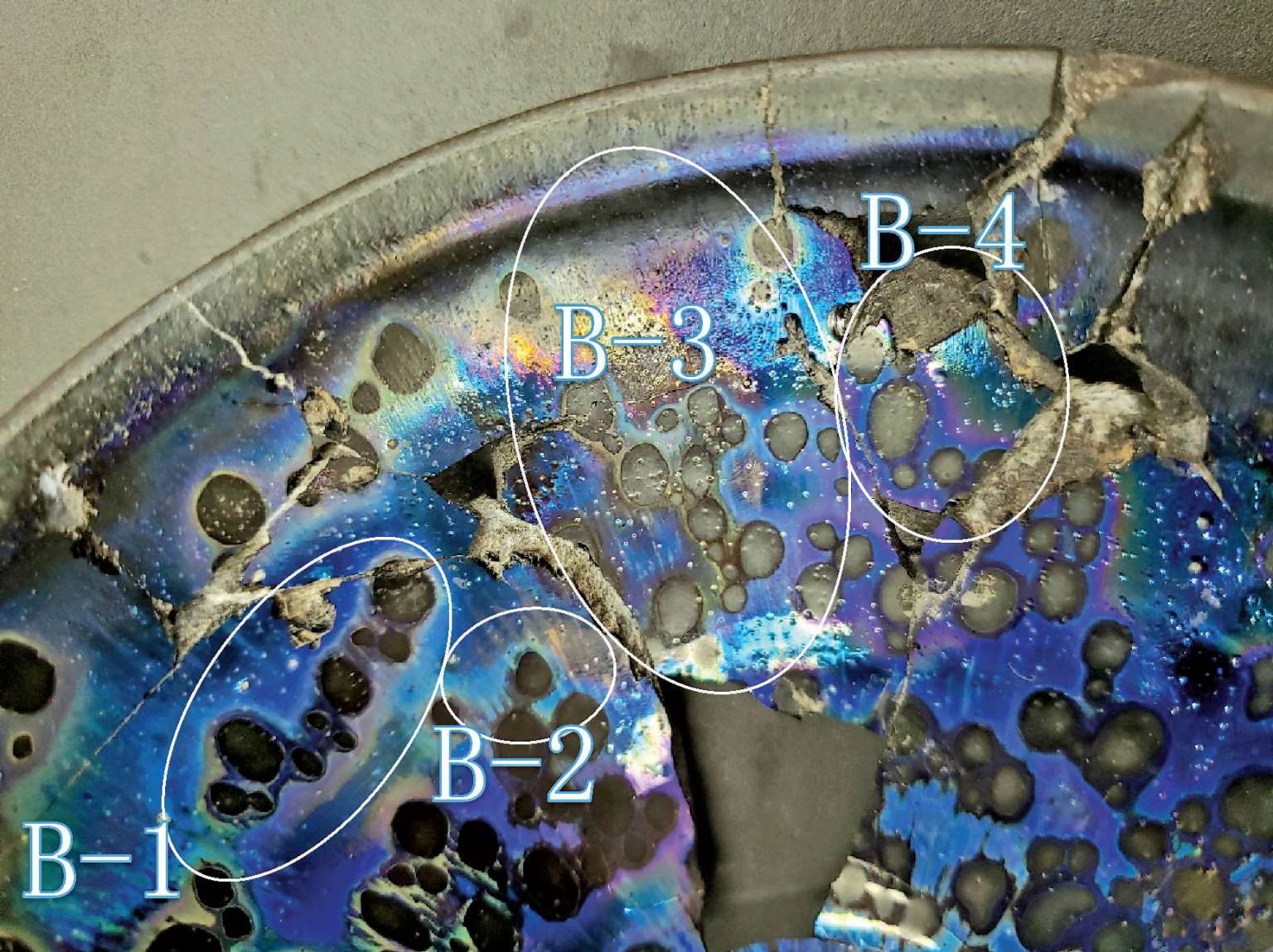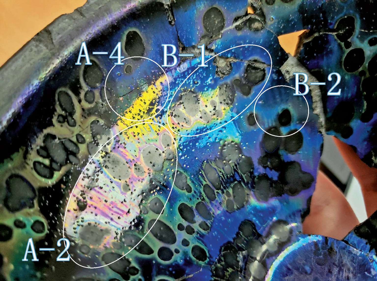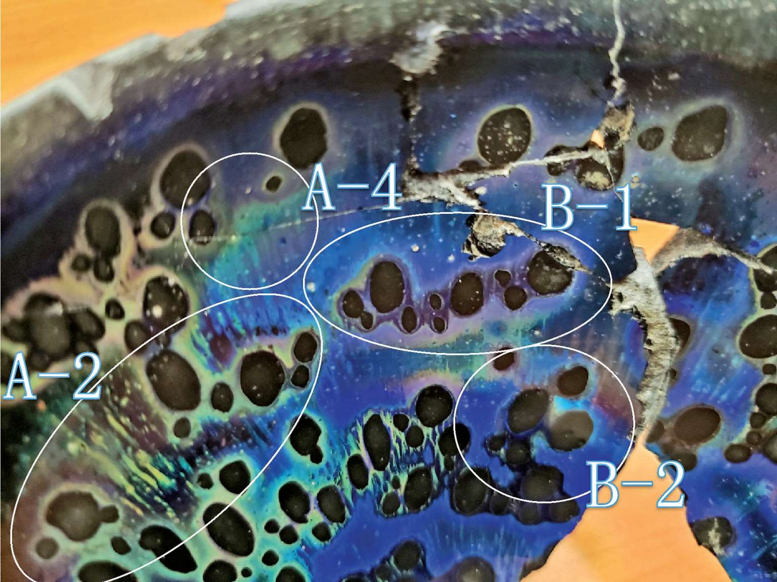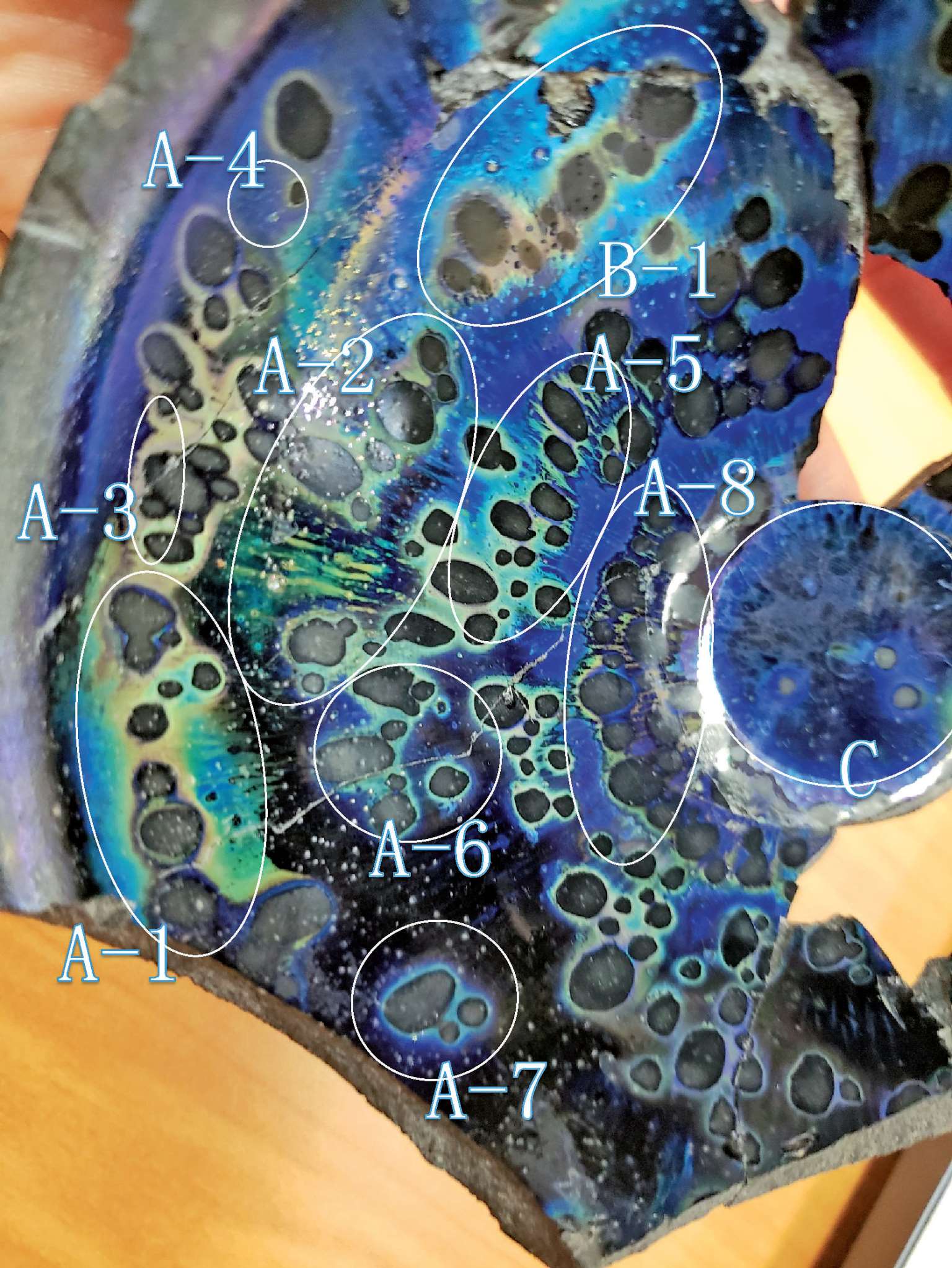 A区约占曜变残盏内壁面积的1/3。在图2-2a的观察方向下,A区诸多斑核周围主要是米黄和青色,彩色区域的光泽不强。口沿下方A-1区的斑核群周围有较大面积的米黄和青色,内壁中上部A-2区存在数条米黄色条纹,接近内底区域有成片蓝紫色。斑核群之间大的空隙区域为黑色,黑色区域面积约占A区的1/3。