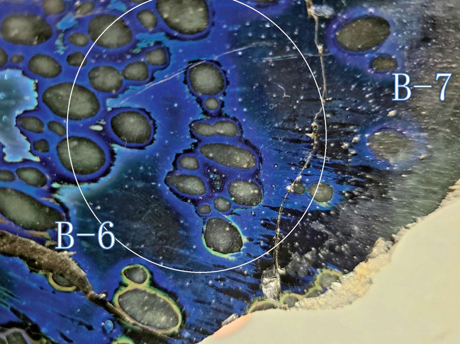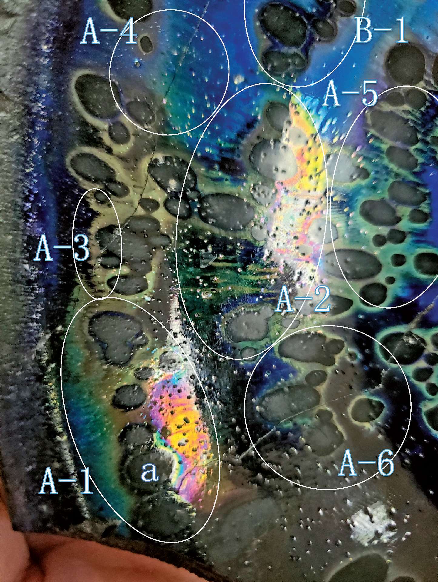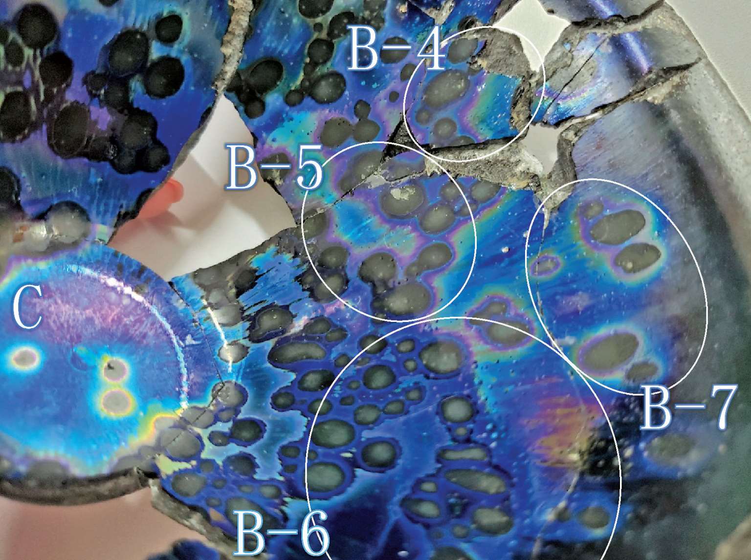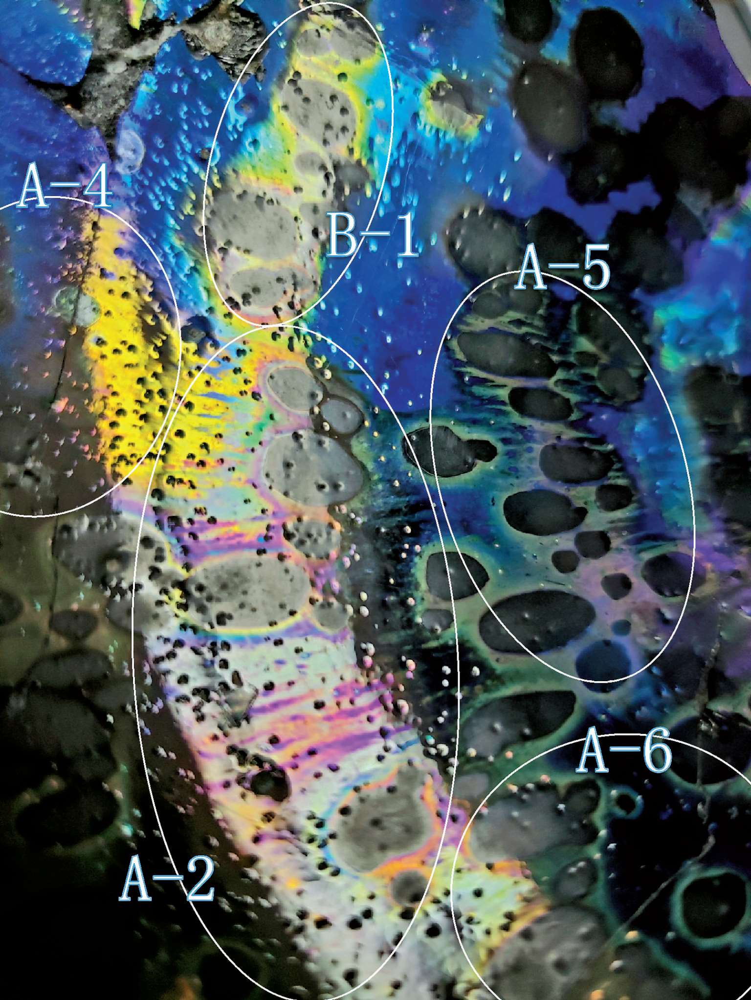 A区约占曜变残盏内壁面积的1/3。在图2-2a的观察方向下,A区诸多斑核周围主要是米黄和青色,彩色区域的光泽不强。口沿下方A-1区的斑核群周围有较大面积的米黄和青色,内壁中上部A-2区存在数条米黄色条纹,接近内底区域有成片蓝紫色。斑核群之间大的空隙区域为黑色,黑色区域面积约占A区的1/3。