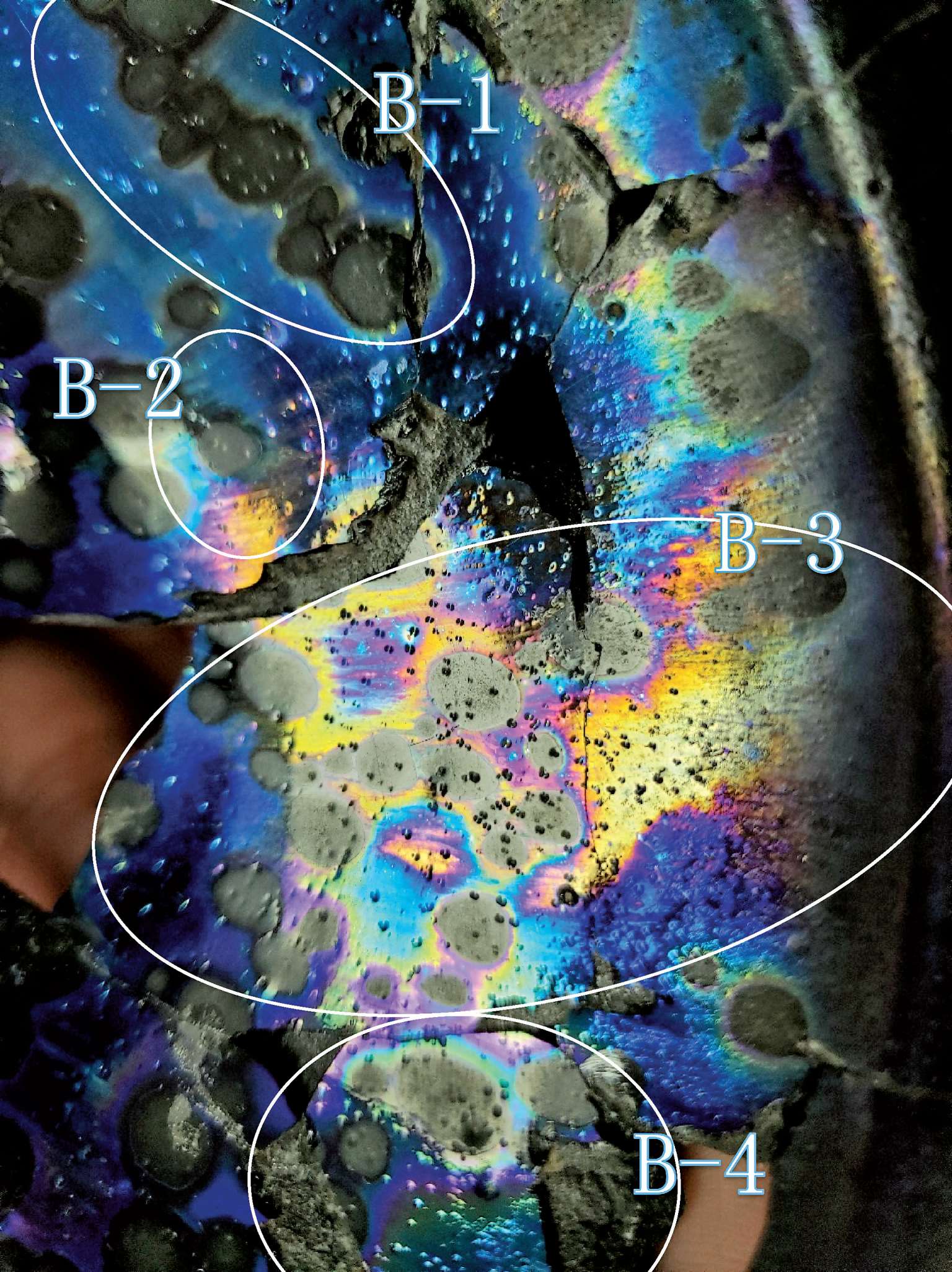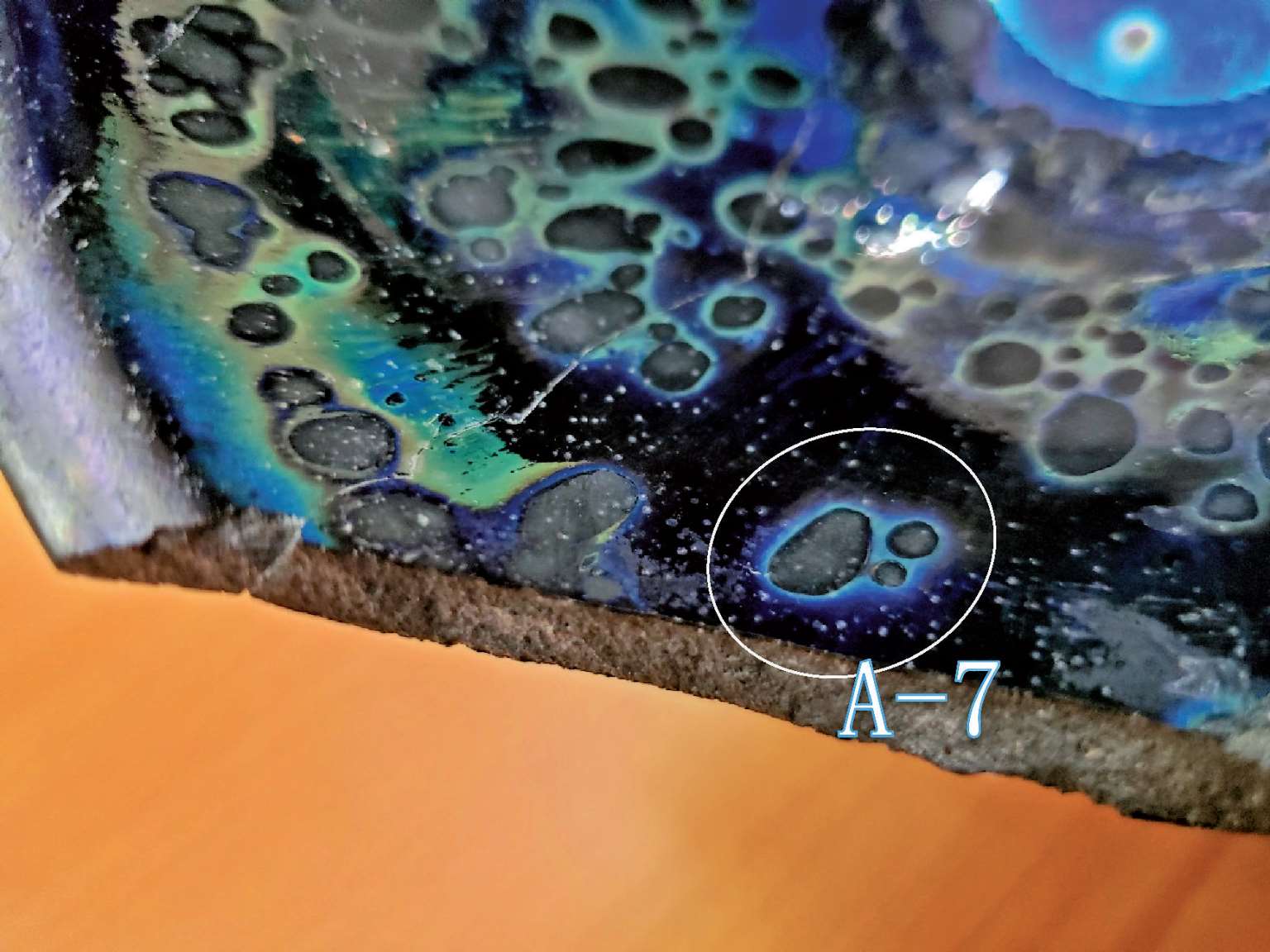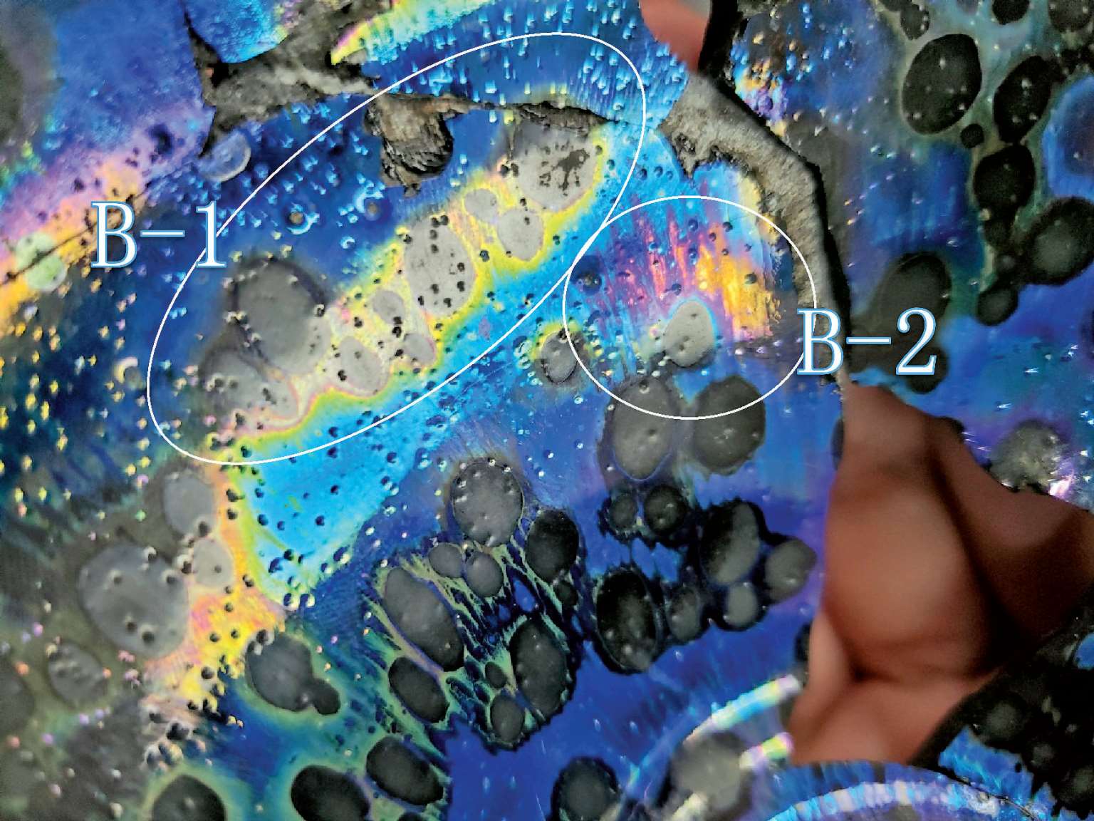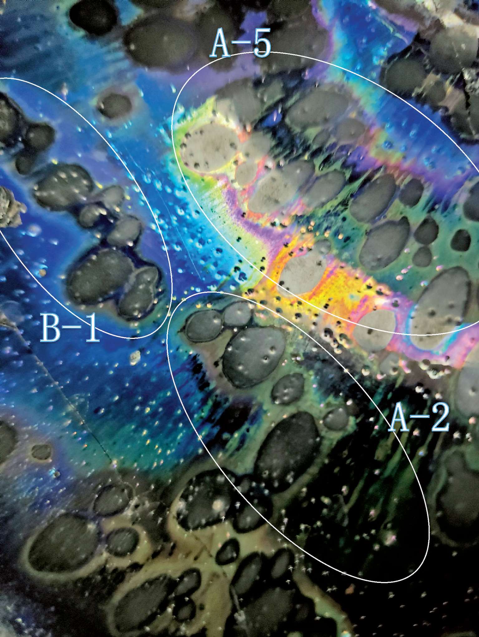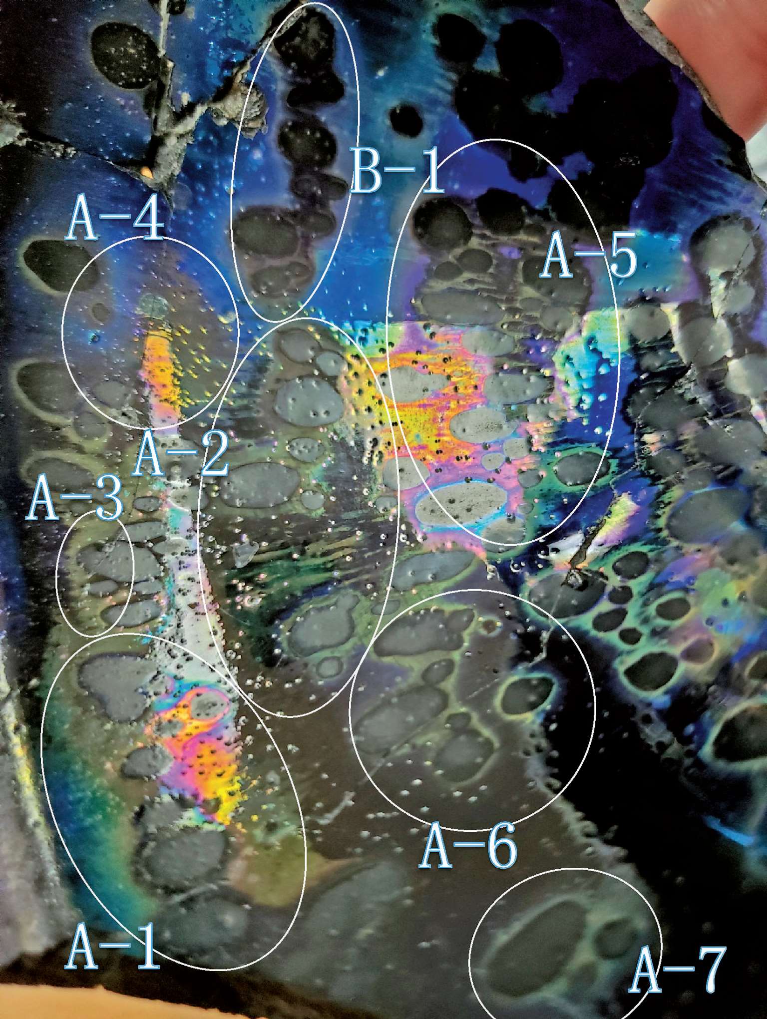 A区约占曜变残盏内壁面积的1/3。在图2-2a的观察方向下,A区诸多斑核周围主要是米黄和青色,彩色区域的光泽不强。口沿下方A-1区的斑核群周围有较大面积的米黄和青色,内壁中上部A-2区存在数条米黄色条纹,接近内底区域有成片蓝紫色。斑核群之间大的空隙区域为黑色,黑色区域面积约占A区的1/3。