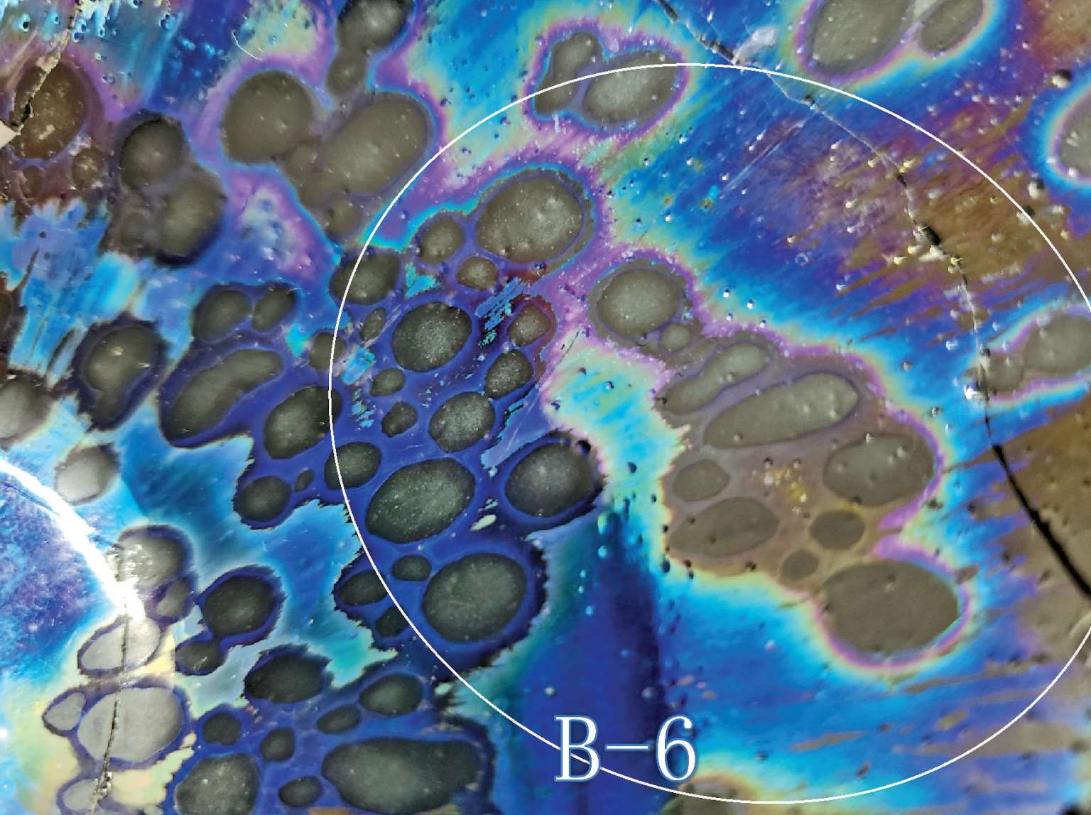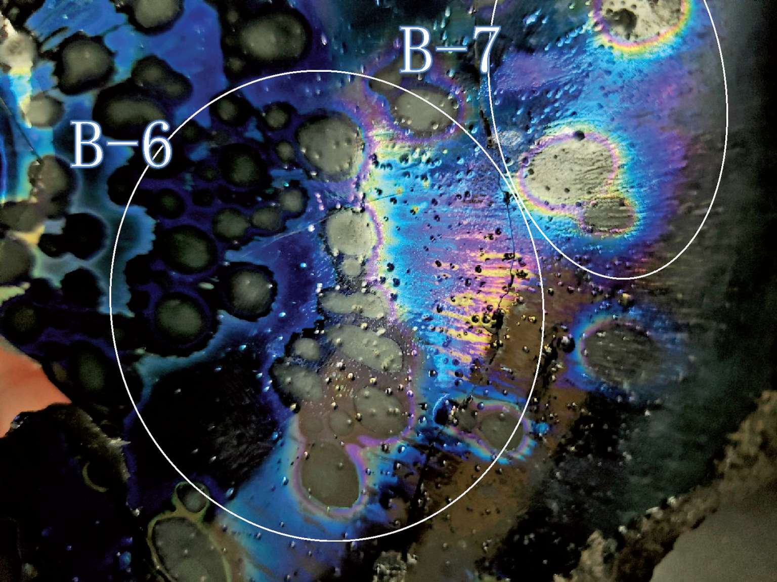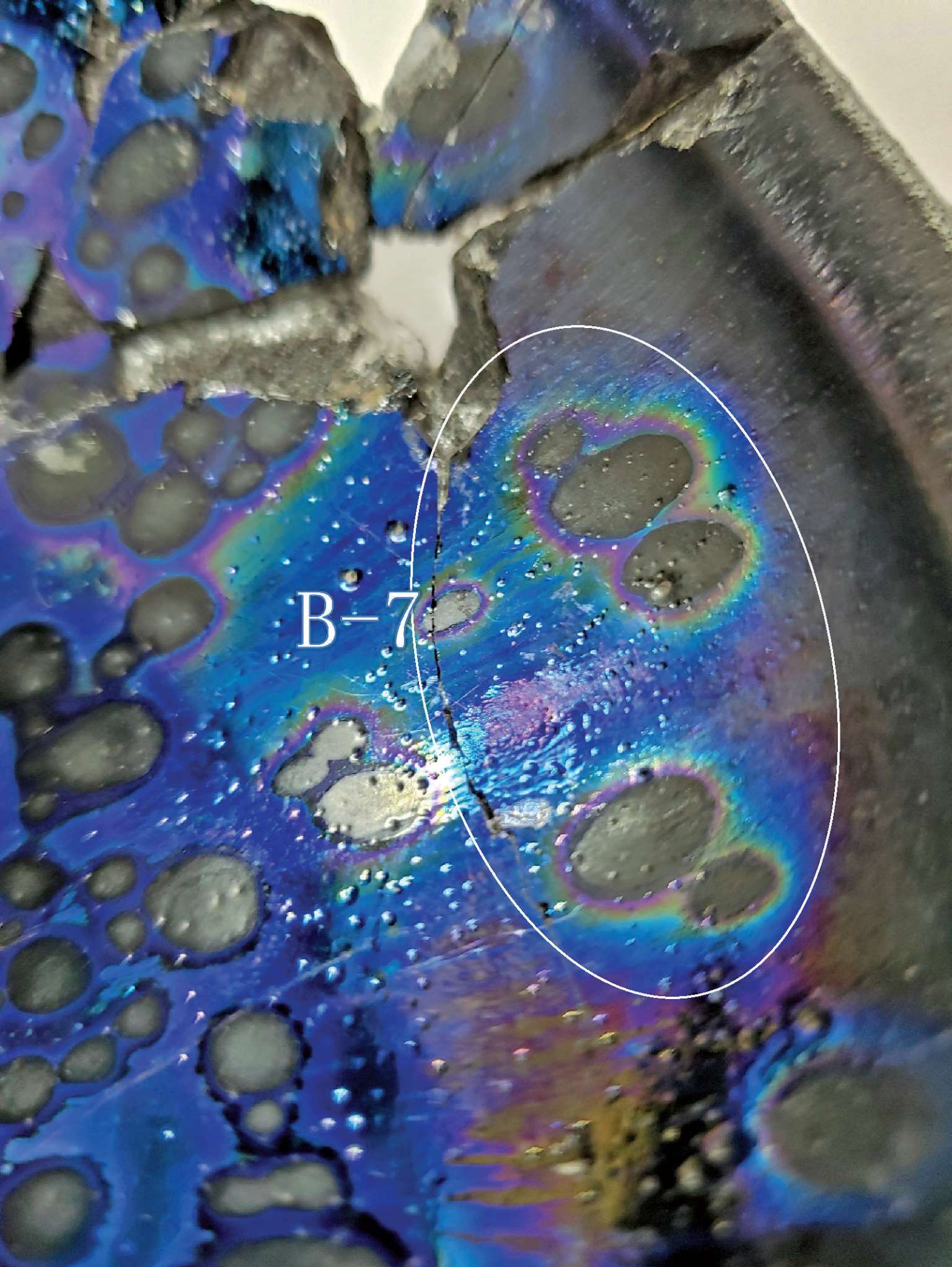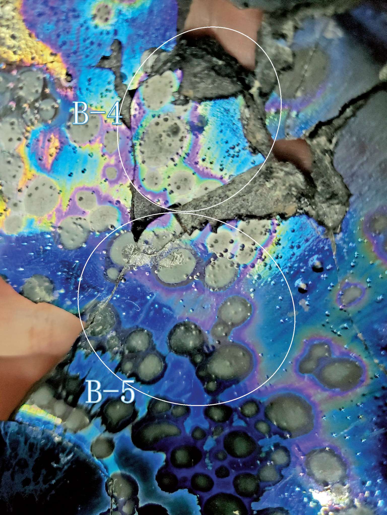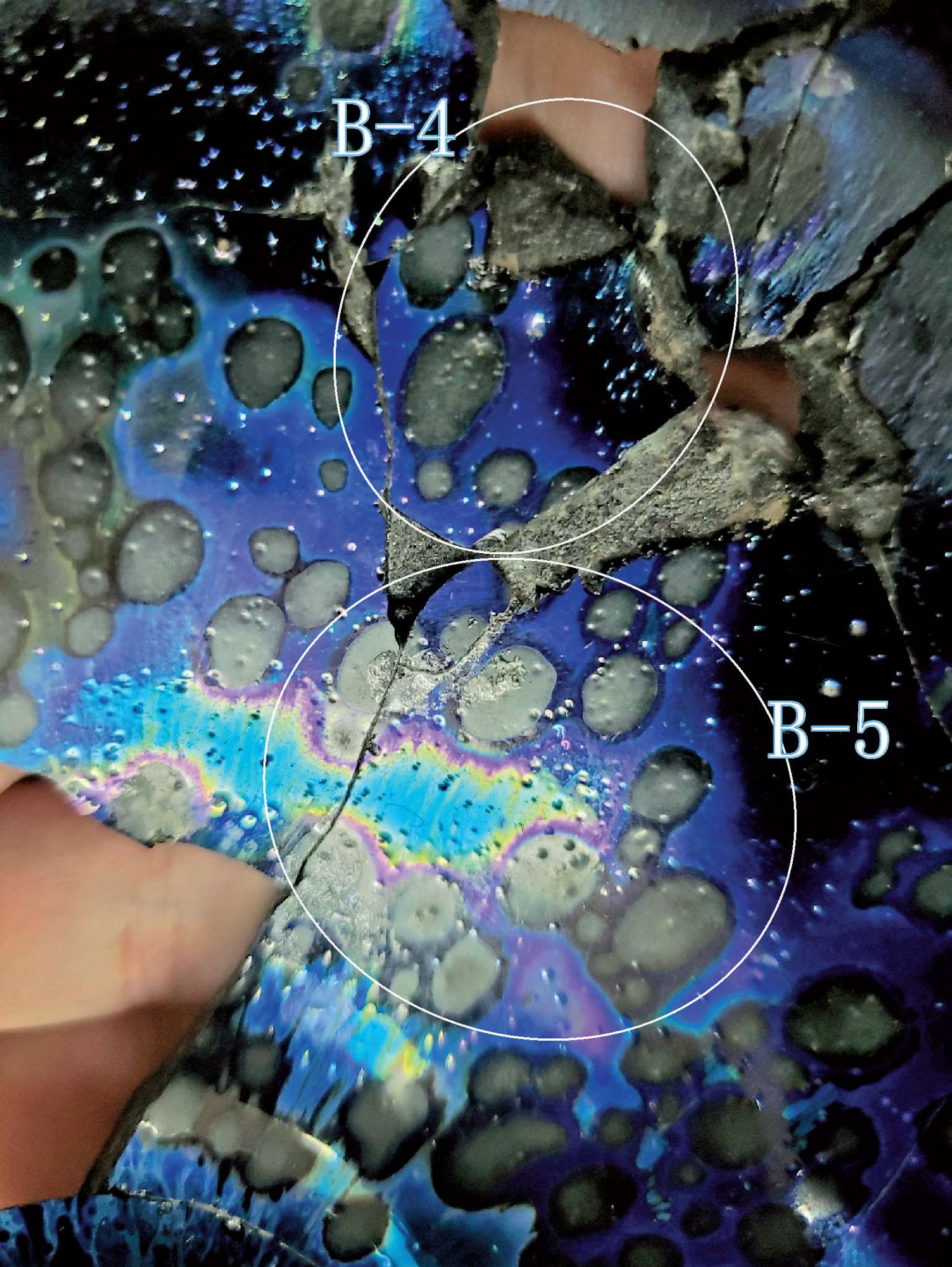 D区指外壁。外壁斑核寥落,大部分区域为黑釉,仅斑核周缘有光晕,釉表面未愈合的开口小气孔密集,外壁黑色釉面上釉流淌痕迹明显,流纹畅达但没有彩色。俯视时外壁斑核周缘的光晕为青色圈外加晕散的蓝色圈(图2-5a)。观察角度增大,色圈的光泽度明显增大,光晕大多变为由内而外的蓝-紫红色圈,某些斑核周缘出现黄-蓝-紫红色圈(图2-5b)。
