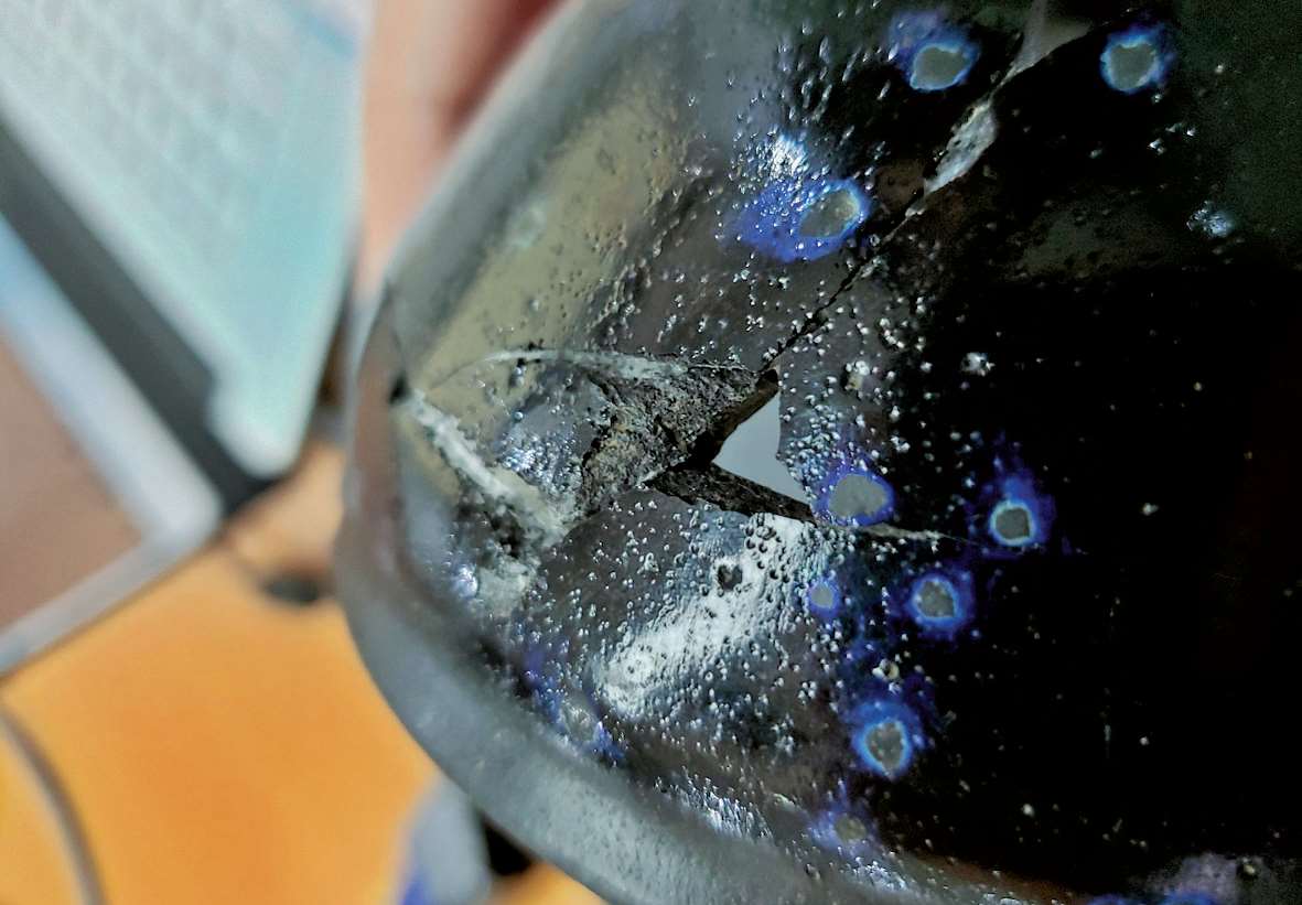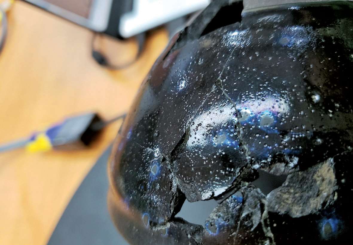 通过转动残盏来观察颜色和光泽变化,腹壁的残缺造成光照的不均匀。在某些角度观察时碗壁本身会遮挡一部分光,而腹壁的残缺部分又会漏光,而且光的遮挡情况与残盏如何摆放有很大关系,从而影响内壁某些位置接受光照的方向和强度。
