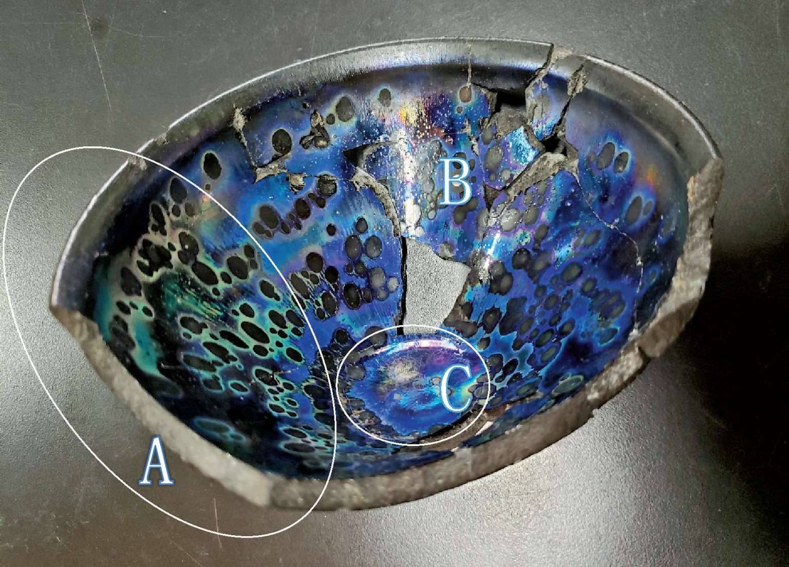 图2-1 曜变残盏内壁的A、B、C三个区域