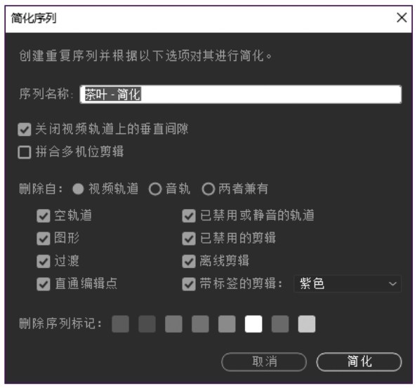 当序列中的素材繁多且杂乱时,可通过简化序列自动删除不需要的轨道及序列上的标记等,让序列看上去更加整洁美观。
