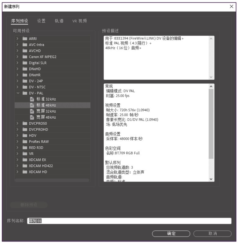 打开“新建序列”对话框(见图2-3),在“可用预设”栏中选择一种预设后,单击