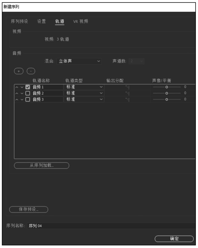 一个序列至少包含一条视频轨道和一条音频轨道,而且其中的视频轨道和音频轨道可以共同并列于“时间轴”面板中。若是视频后期制作过于复杂,可能需要运用多条视频轨道和音频轨道进行叠加或混合制作。因此,在新建序列时还可以设置序列的视频轨道数量。