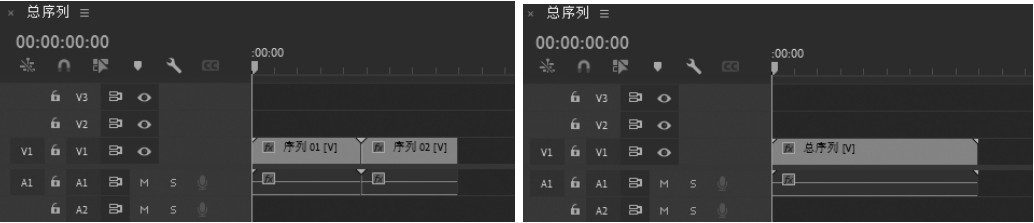 按钮,如图2-7所示。完成嵌套序列的操作后,“时间轴”面板中的两个序列文件将转换为一个序列文件。图2-8所示为嵌套序列前后的对比效果。
