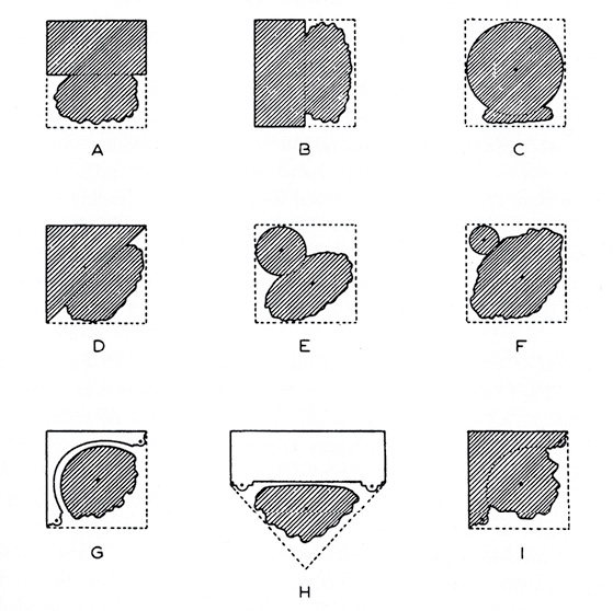 在建筑上,这一风格要求墙体和拱顶集中于管状的柱身和肋拱,它们的中心在当时的建筑图上由小点明确标示(图29);在雕塑上,它要求的是我曾经建议使用的一个术语,“凸圆形宝石浮雕”[ relief en cabochon ],将其设想成从一个平面自身往外部凸出的形式(不论这个平面是否有形的存在,还是由人物形状暗示出),转变成以自身内部的轴线为中心的形式。门窗侧壁人物——原本可以说是一块过度雕凿的浮雕(图30,正文插图1A、B),即便这块浮雕的“底面”碰巧,在一些例外的事例中,是一根圆柱(正文插图1C)——发展成了依附于细长柱的真正雕像,这两个组成部分源自一个过程,它开始呈对角而非正面或侧面的冲击方块(图31,正文插图1D)。这种新方法导致了图像与也许可称作“残余体量”二者形成两个基本上为圆柱体的构件,雕像和细长柱(图32,正文插图1E);接下去细长柱逐渐变细(图33,正文插图1F),最后消失,人物已完全成为独立式的,要么置于壁龛内,要么紧靠墙面(正文插图1H),在这个事例里,这一发展过程又回到了原点。类似的过程也可见于拱门饰的演变上(正文插图1I);而在浮雕构图中扮演角色的人物形象在虚构的背景前活动,犹如演员处在一个小型戏剧舞台的平台上(图34)。 34