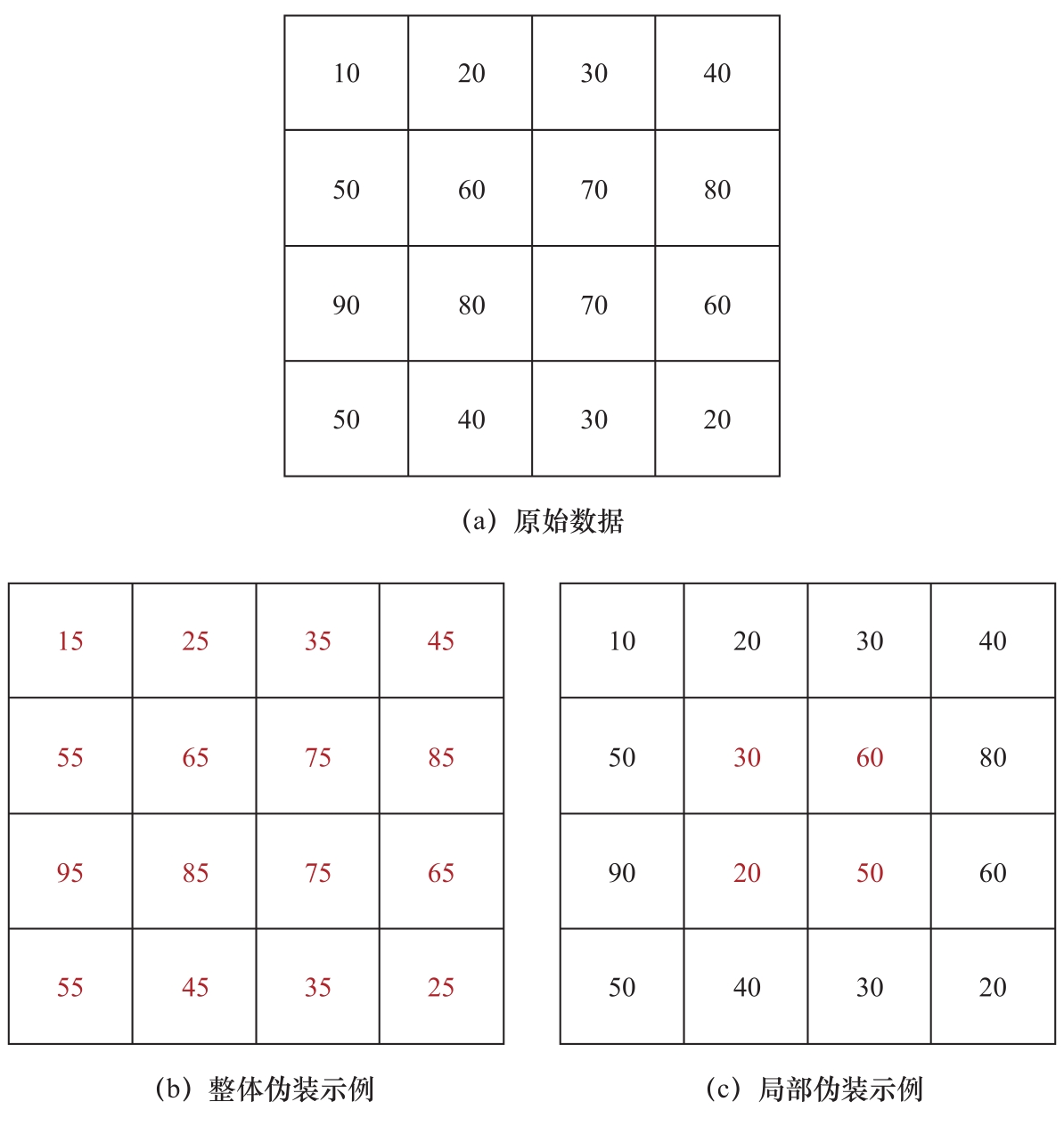 式中, H 0 ( x , y )和 H 1 ( x , y )分别代表原始数据和伪装数据, F 代表伪装操作。该处理方法可以仅针对数据内容中的单个元素价值进行伪装,也可以一次对若干元素组成的价值区域进行伪装。
